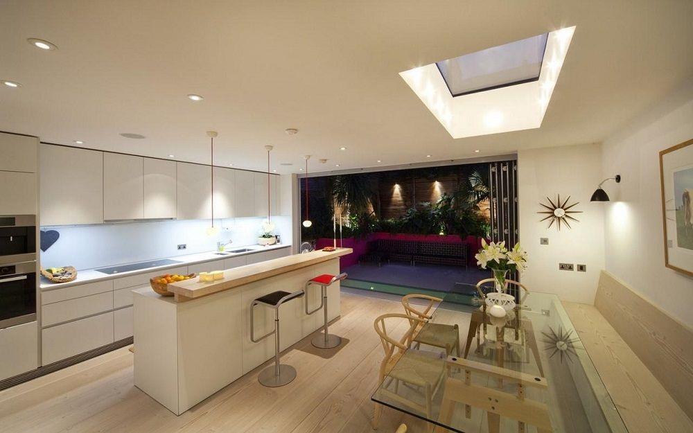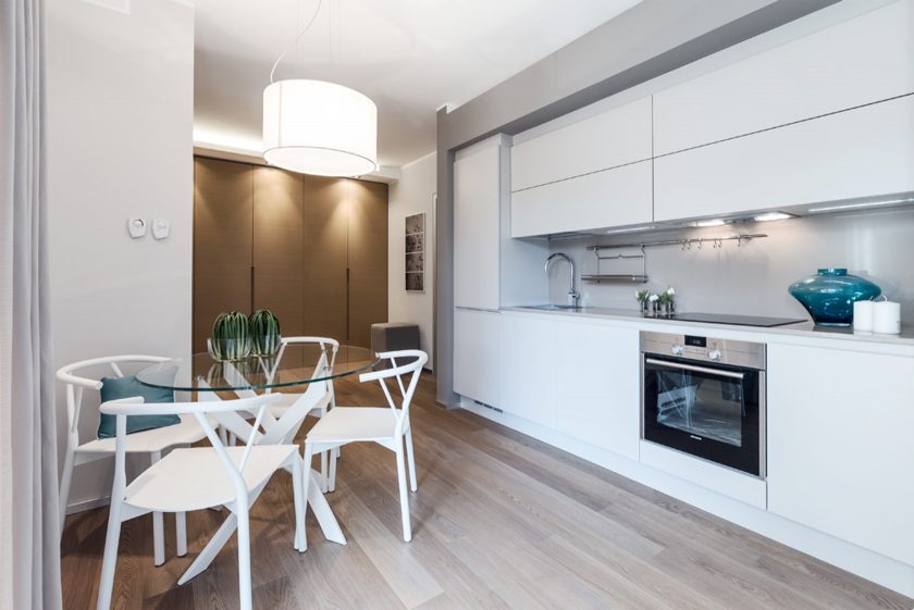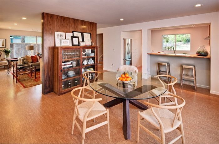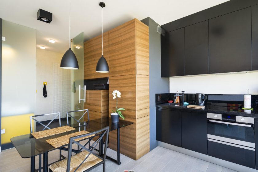 Em salas pequenas você pode jogar texturas. Para a superfície de trabalho, escolha de vidro temperado colorido e faça a área de jantar a partir de materiais transparentes.
