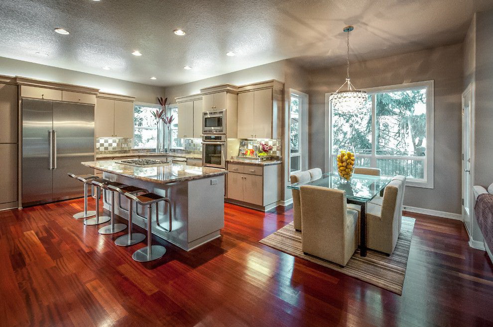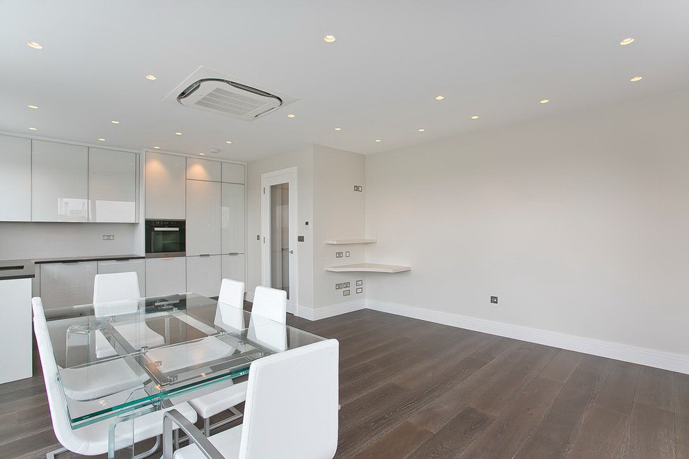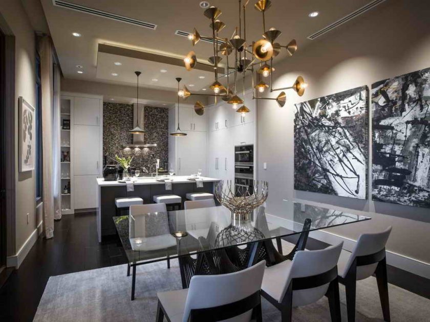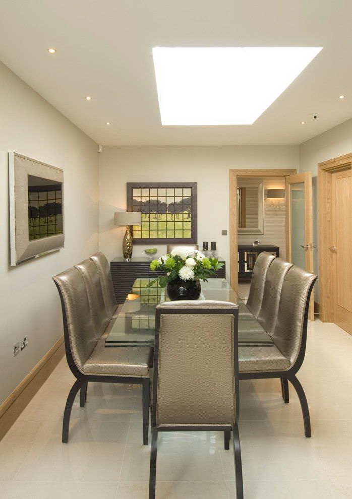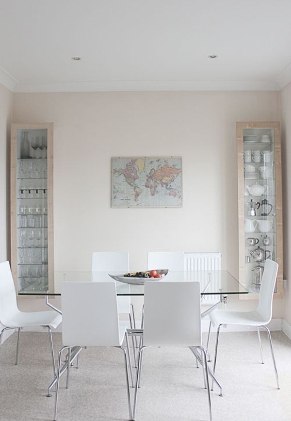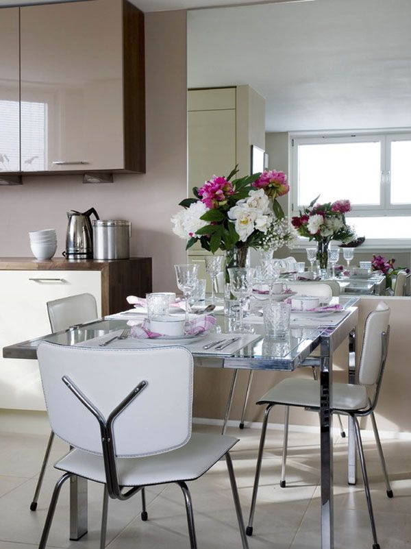 Quer jantar área "dissolvido no espaço"? Escolha uma bancada de vidro com pernas e cadeiras banhadas a níquel com assentos transparentes e encostos de plástico grosso.