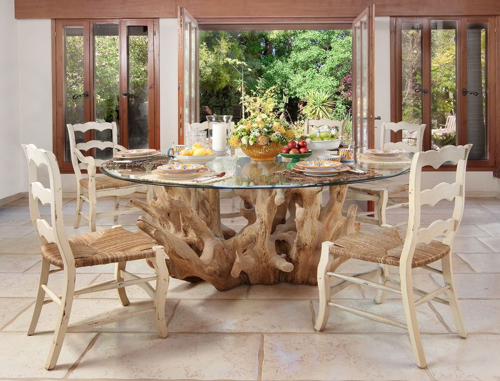 Para os amantes da oferta exclusiva para fazer uma mesa para recreação ao ar livre. Uma peça incomum de mobília para a casa de campo ou uma casa de campo é feita de um tronco ou de um tronco de árvore grosso. Na parte inferior do log, é necessário cavar um furo semicircular no qual os pontos pontuais são alimentados. luminárias. Efeito lareira protegido. Tampe o vidro temperado e pegue uma mesa incomum que corresponde ao ambiente natural de uma casa de campo.