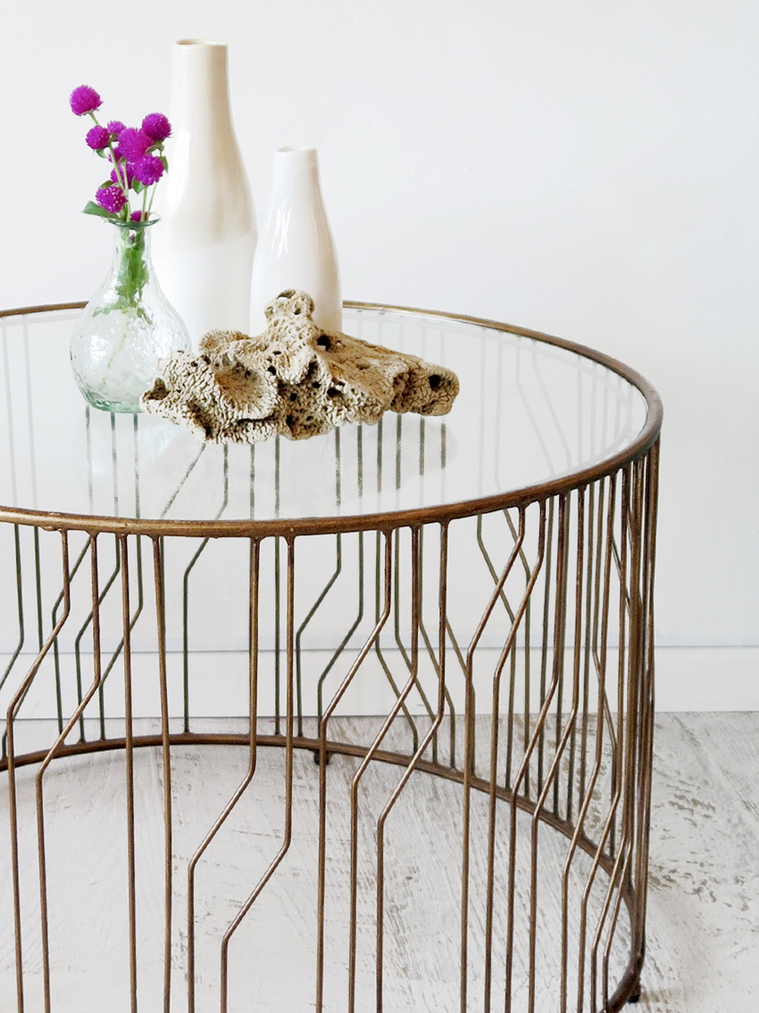 - Rococó - pernas de metal com elementos imitando conchas, vidro em uma borda de metal.