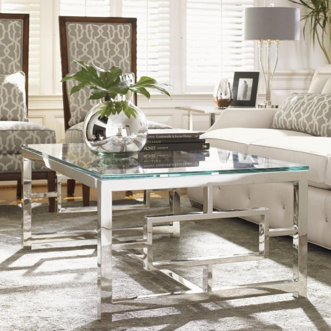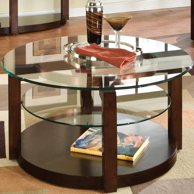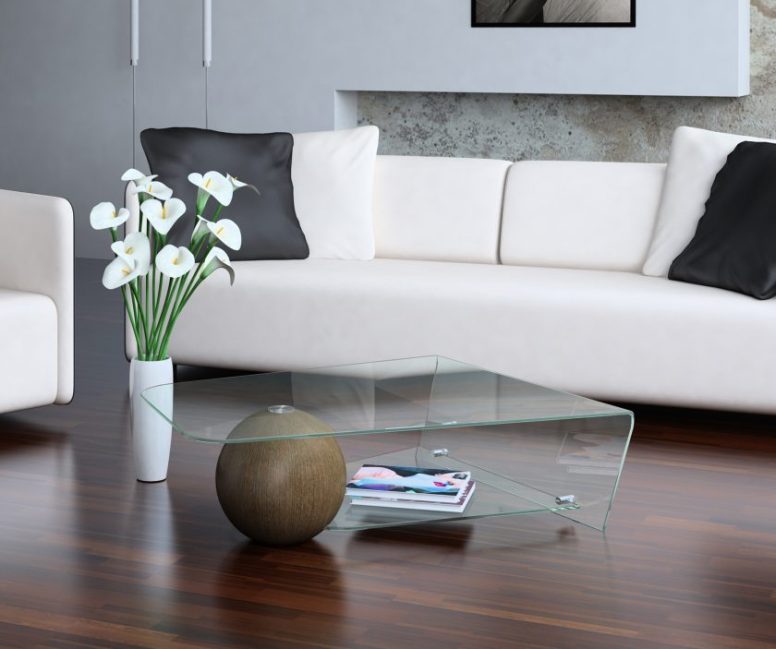 Você não quer escolher os modelos de madeira habituais de mesas de café? Opções de móveis com tampos de vidro mudam o interior de uma maneira incomum. O que é esse material incomum? Apenas vidro transparente dissolve a superfície e a cor tem uma superfície brilhante maravilhosa.