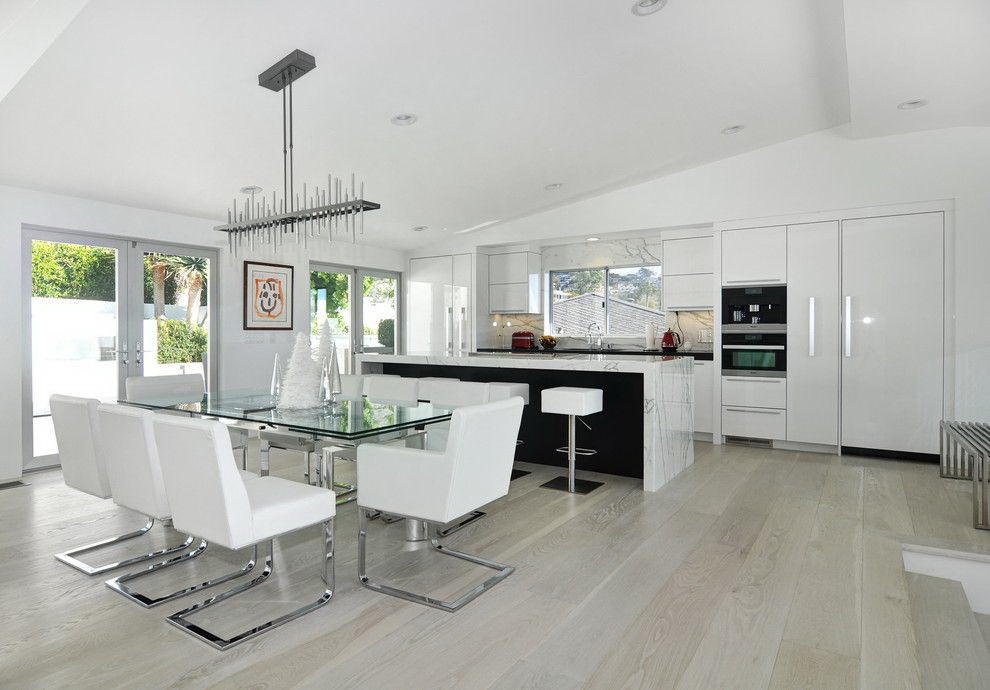 A base de plástico sob a mesa harmoniza notavelmente com as cadeiras de textura e cor semelhantes. Complete a cozinha lacônica com frentes de vidro com uma mesa transparente e cadeiras de ferro forjado com elementos de vime. O efeito vai agradar você.