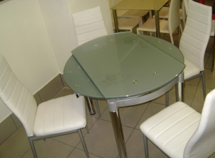 Esta é uma questão importante. Tabelas com uma mesa de vidro como um enxerto combinado. Como as pernas são a base das tabelas, a segurança depende da sua confiabilidade. É necessário considerar o estilo da cozinha: