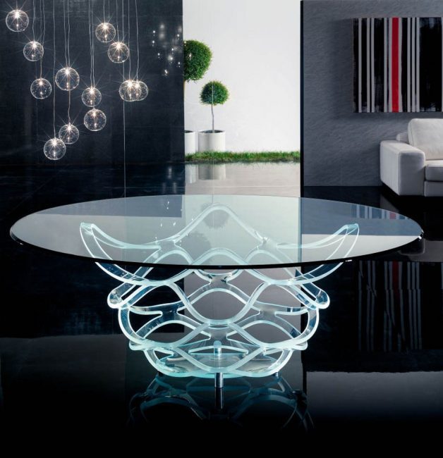 Tal material dá uma ampla gama de fantasia para design de interiores. Vamos falar sobre os recursos. Muitas vezes, a palavra vidro cria uma imagem de uma superfície transparente, que passa a luz através de si mesma, não se torna um obstáculo, não esconde objetos e partes. Sim é isso. A indústria da construção fabrica vários tipos de vidro para a produção de mesas exclusivas: