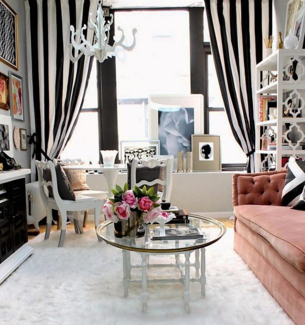 Superfícies de vidro equilibram grandes itens interiores. Não tenha medo de superfícies transparentes. O vidro temperado pode suportar não apenas o peso dos óculos, mas também objetos mais pesados: vasos, estatuetas de porcelana.