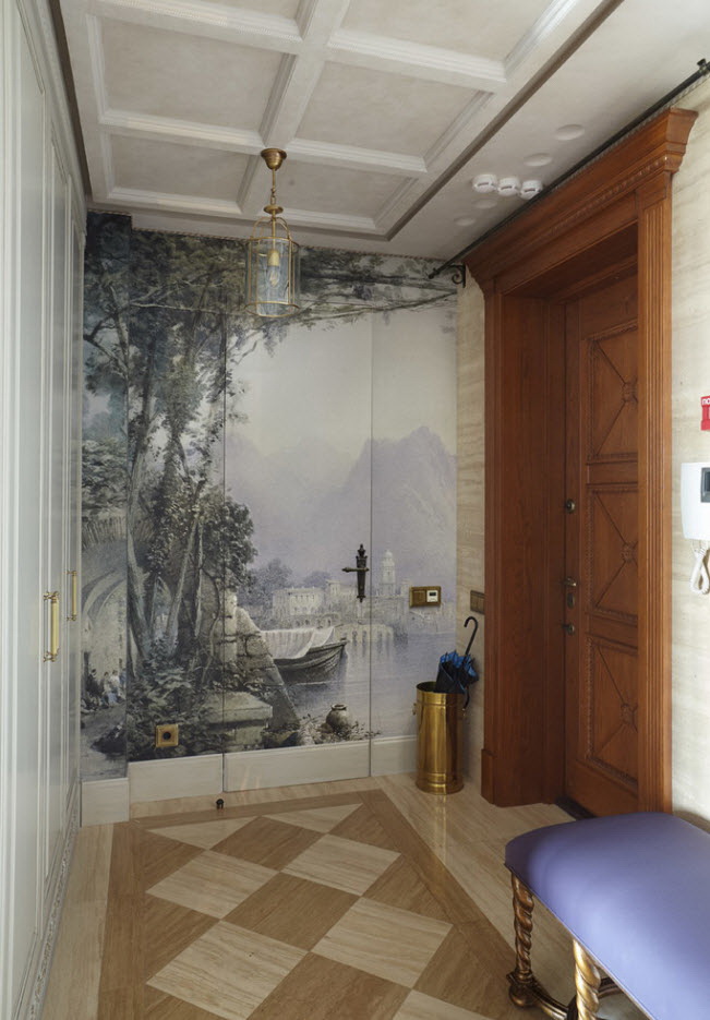 Entre as formas incomuns de decorar as paredes destacam-se papéis de parede que transformam as paredes do corredor em pinturas acabadas. O material é adequado para proprietários de corredores pequenos e bem iluminados com móveis em miniatura. Fotomural - sotaque hall, então a decoração é colocada ao redor sem perturbar a integridade da imagem.