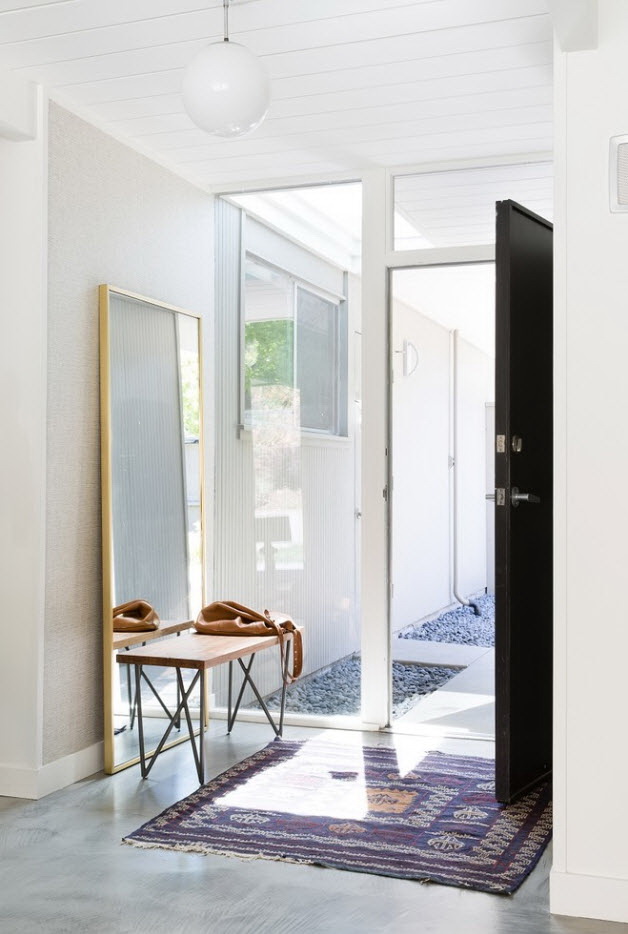 A parte livre da parede ou os cantos da sala colocam pequenos painéis de espelho, dividindo o corredor em áreas funcionais. De frente para o topo das paredes aumenta significativamente a altura do teto, dando o interior "airiness".