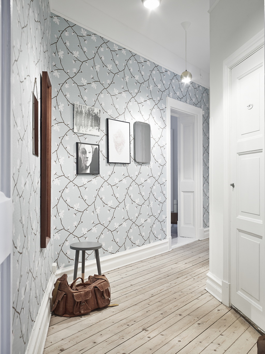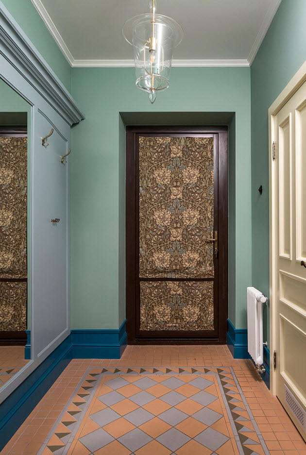O esquema de cores do papel de parede deve ser combinado com uma sugestão de painéis de porta que são colocados no corredor.