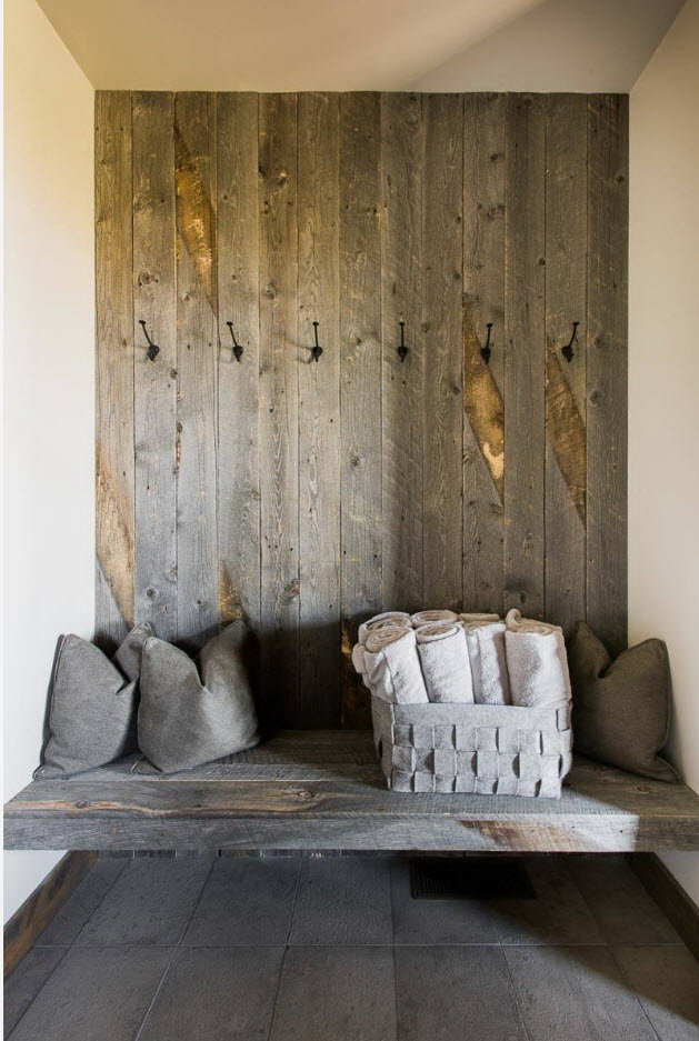 Painéis de madeira são instalados na parede vazia como um acento do interior do corredor. Recomenda-se escolher tábuas largas com uma textura pronunciada de madeira, as paredes restantes são decoradas com gesso ou papel de parede para pintar.