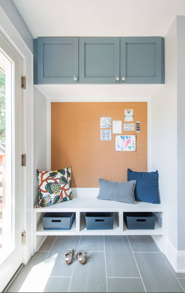 Painéis de parede de cortiça são populares entre os proprietários de pequenos corredores. A textura pronunciada e as várias cores do material são complementadas por uma abundância de espelhos, lâmpadas e plintos largos.