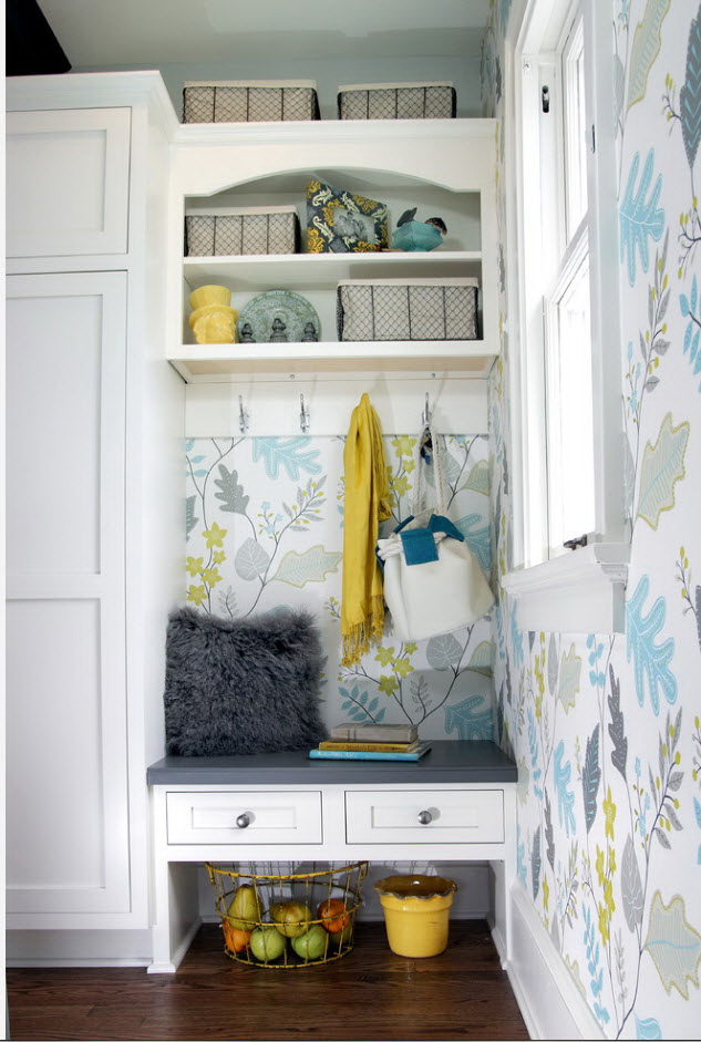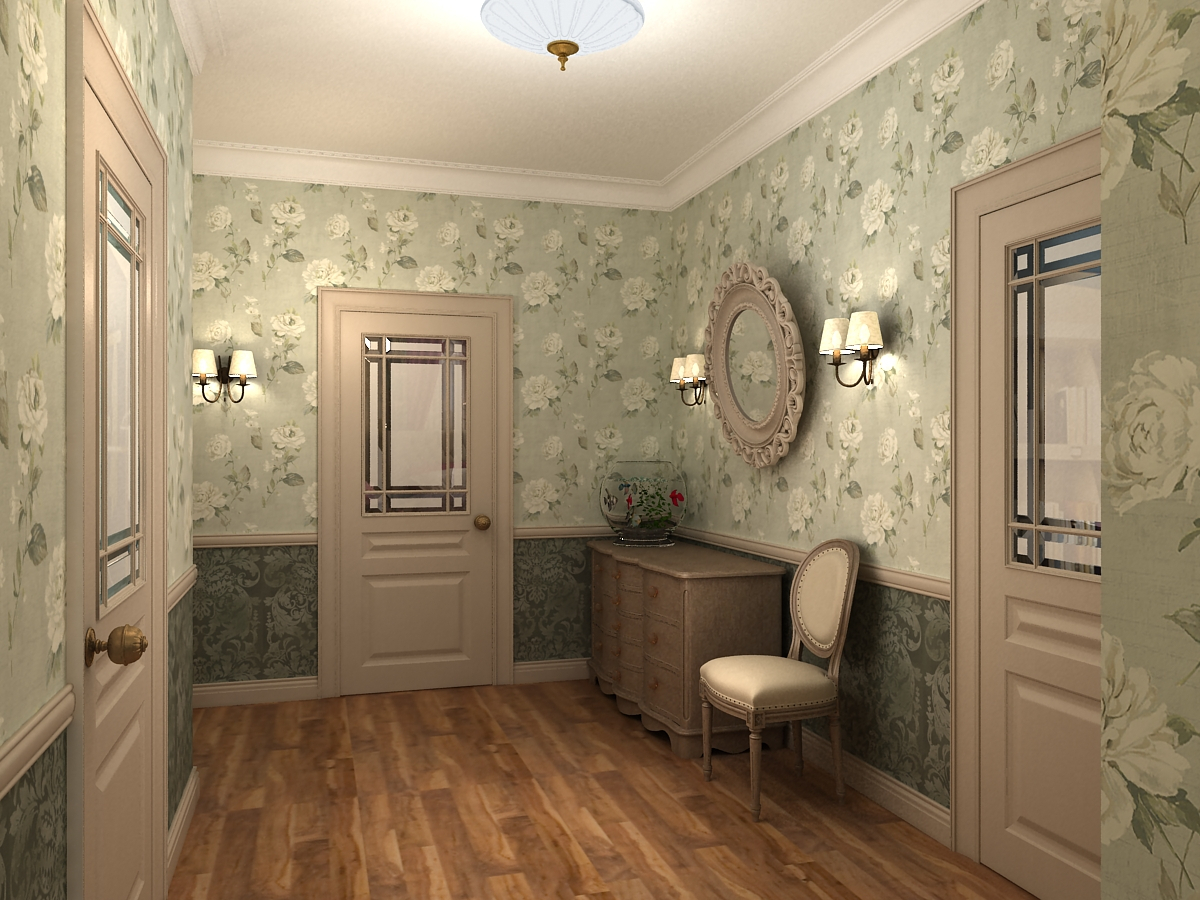 Papel de parede liso com glitter, pequenos padrões geométricos ou florais são adequados para corredores de tamanho modesto. Cores quentes de areia, creme, mar ou madeira são combinadas com a maioria dos materiais. Tons frios, cores brilhantes, uma abundância de contrastes criam um interior “suculento”, que é melhor complementado por móveis de cores claras.