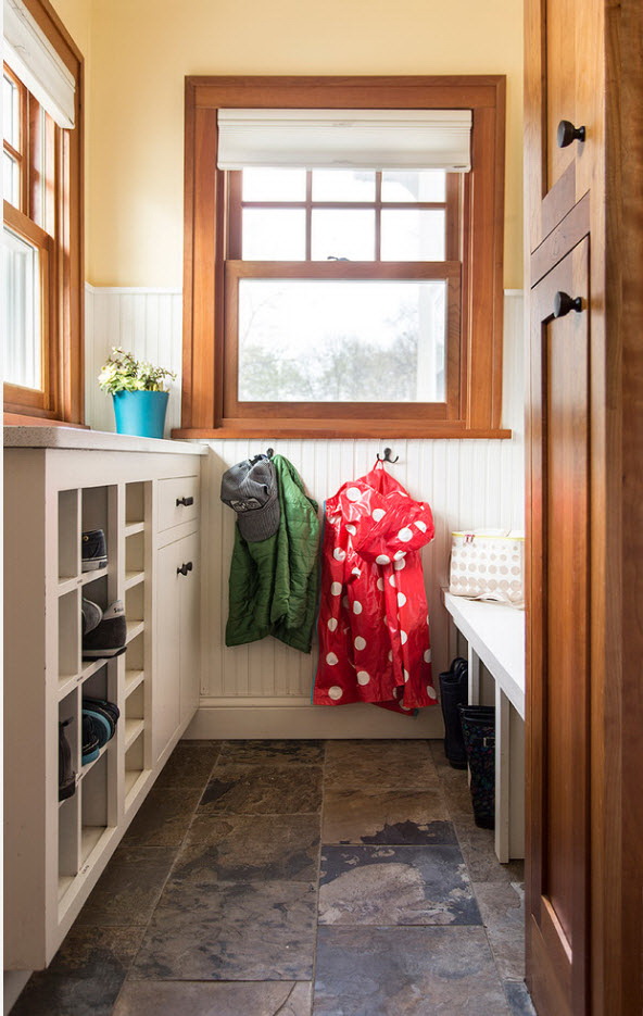 As paredes são revestidas com materiais resistentes ao desgaste, a parte inferior é decorada com plintos largos de madeira, painéis de pedra artificial, madeira dura. Isso protege a superfície contra danos mecânicos.