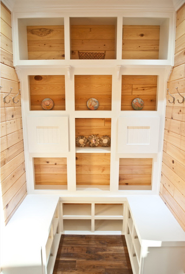 Painéis de madeira clara pode cobrir completamente as paredes do corredor em estilo country, provençaretrô. Ornamentos esculpidos em madeira natural dão ao quarto um toque de antiguidade clássica.