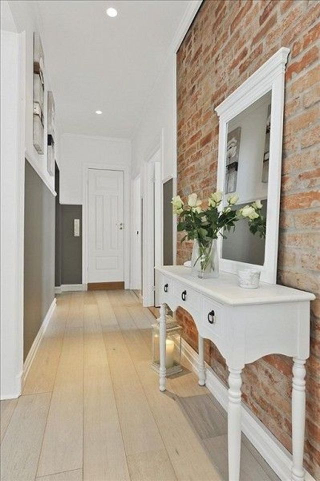 A popularidade do estilo loft leva ao surgimento de várias maneiras de imitar uma parede de tijolos no corredor. A alvenaria clássica é pintada com tons claros, criando um interior elegante.