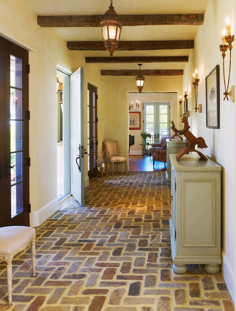Apartamentos com salões espaçosos que passam pelo corredor podem ser feitos de vários materiais.. Por exemplo, a combinação de painéis de madeira na metade inferior das paredes e papel de parede - no topo, cria uma sala em estilo retrô. Corredores em casas de campo para famílias grandes tornam duráveis pedra artificial e gesso.