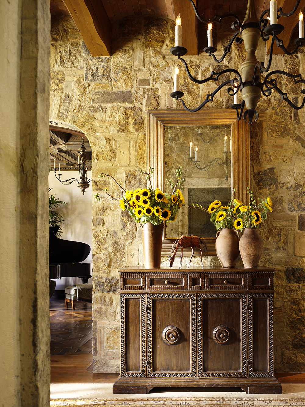 Como decoração, uso elementos de madeira ou pedra. Os proprietários dos amplos salões com janelas complementam a decoração de afrescos, nichos, estátuas, uma densa camada de reboco texturizado.