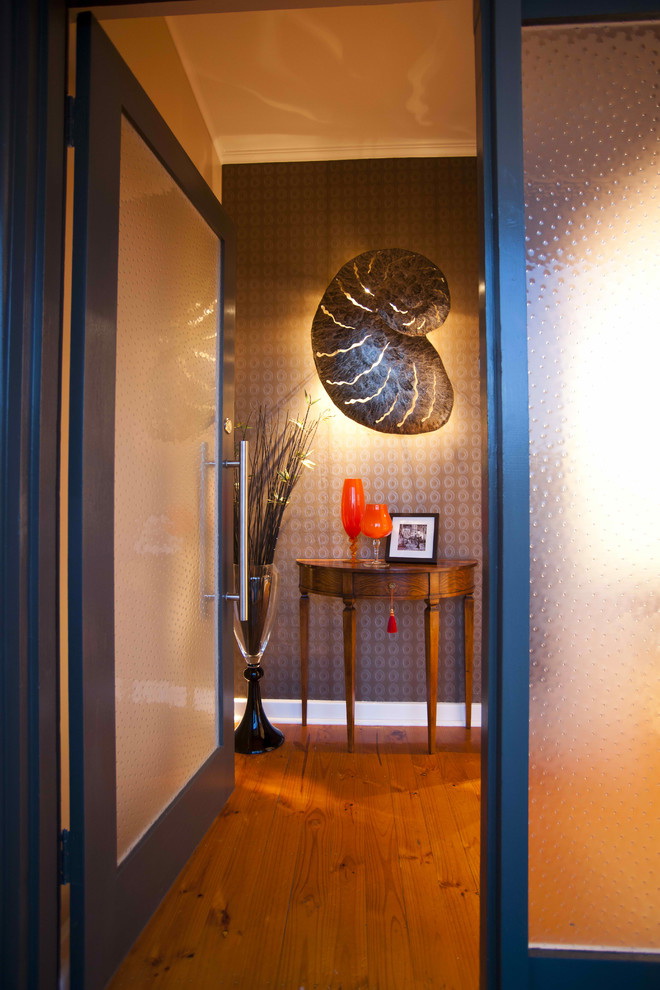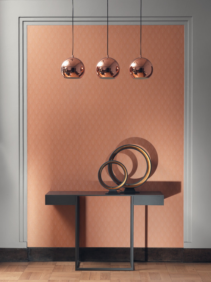 Os proprietários de corredores em miniatura com falta de iluminação natural escolhem papel de parede com uma textura reflexiva brilhante que visualmente expande o espaço. A abundância de partículas "espelho" dá a leveza interior, distrai a atenção da mobília e da decoração. Estes papéis de parede são leves, não exigem o alinhamento das paredes, caem facilmente em uma superfície áspera, combinada com a maioria dos estilos.