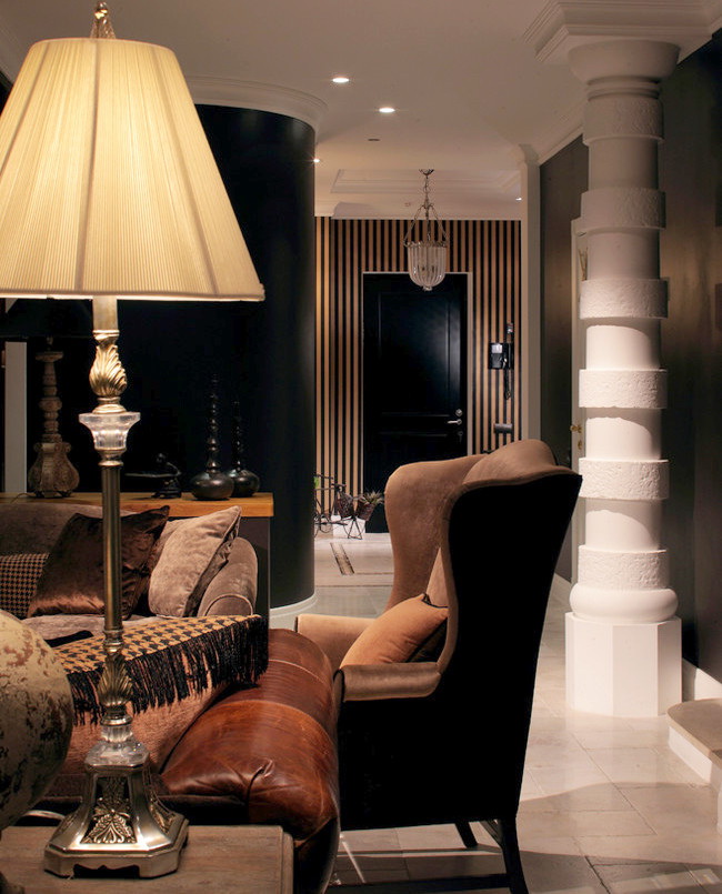 Cores contrastantes ou materiais de textura criam um interior clássico rigoroso. Por exemplo, a combinação de gesso texturizado com painéis de nogueira escura lacada cria um sabor vintage da sala.