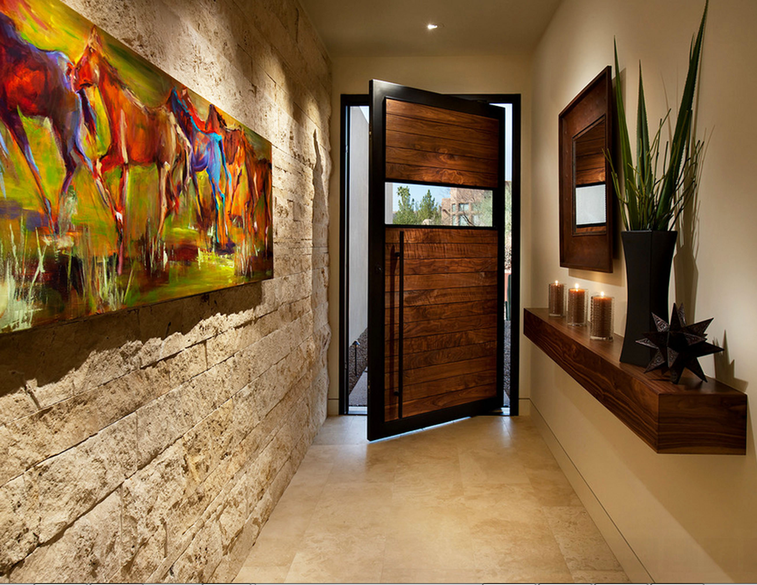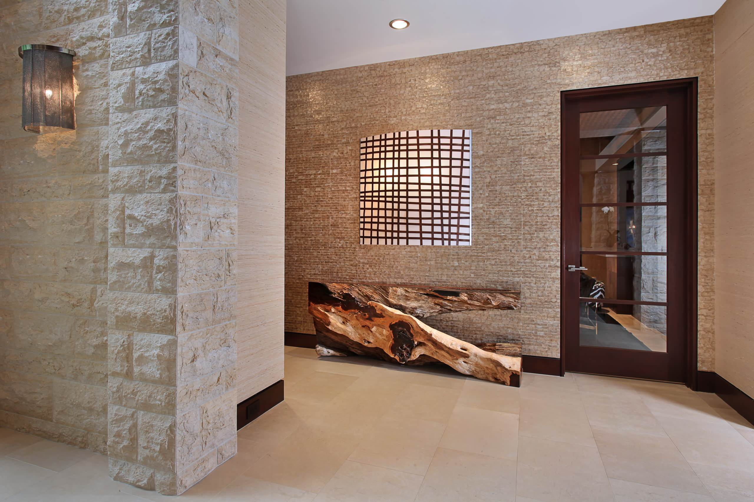 Pedra natural ou acrílica (artificial) é usada para decoração contínua de parede ou colocação de acentos na decoração do corredor.