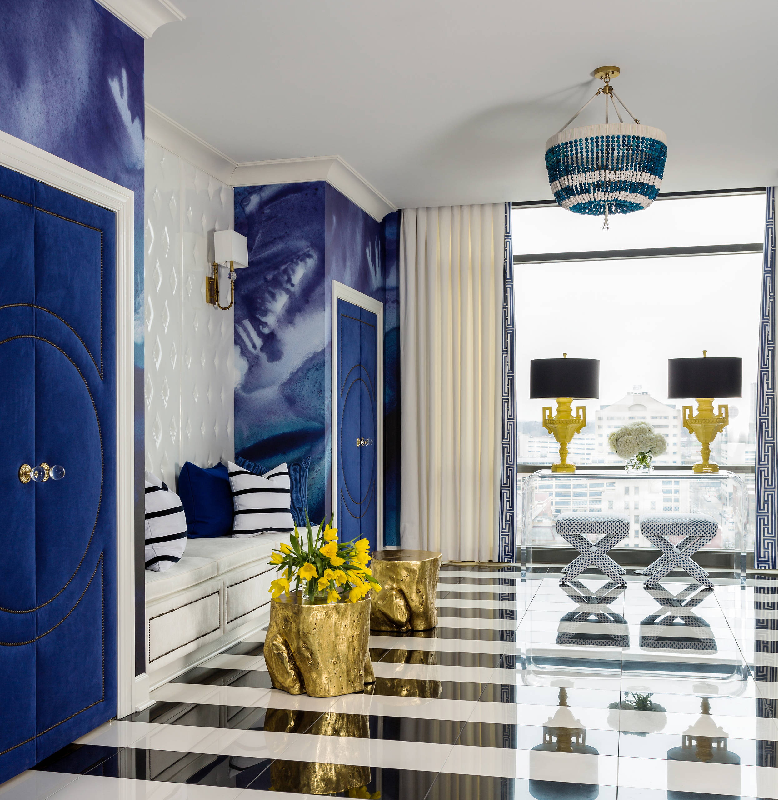 Tons frios combinados com uma abundância de espelhos requerem a instalação de luminárias, o interior como um todo parece mais "arejado".
