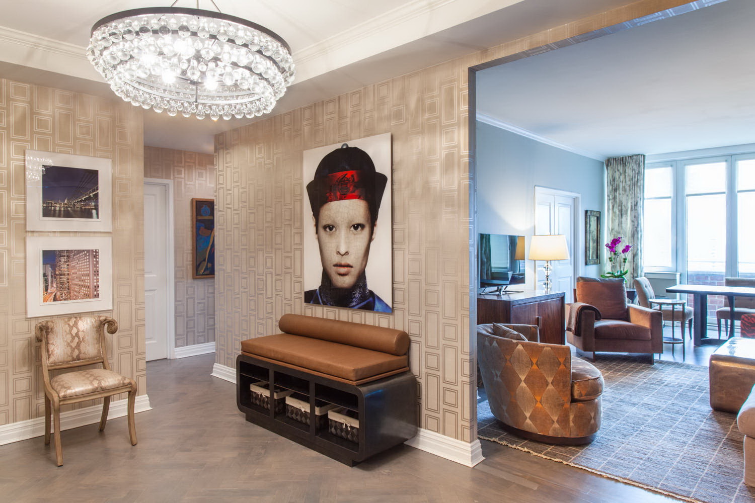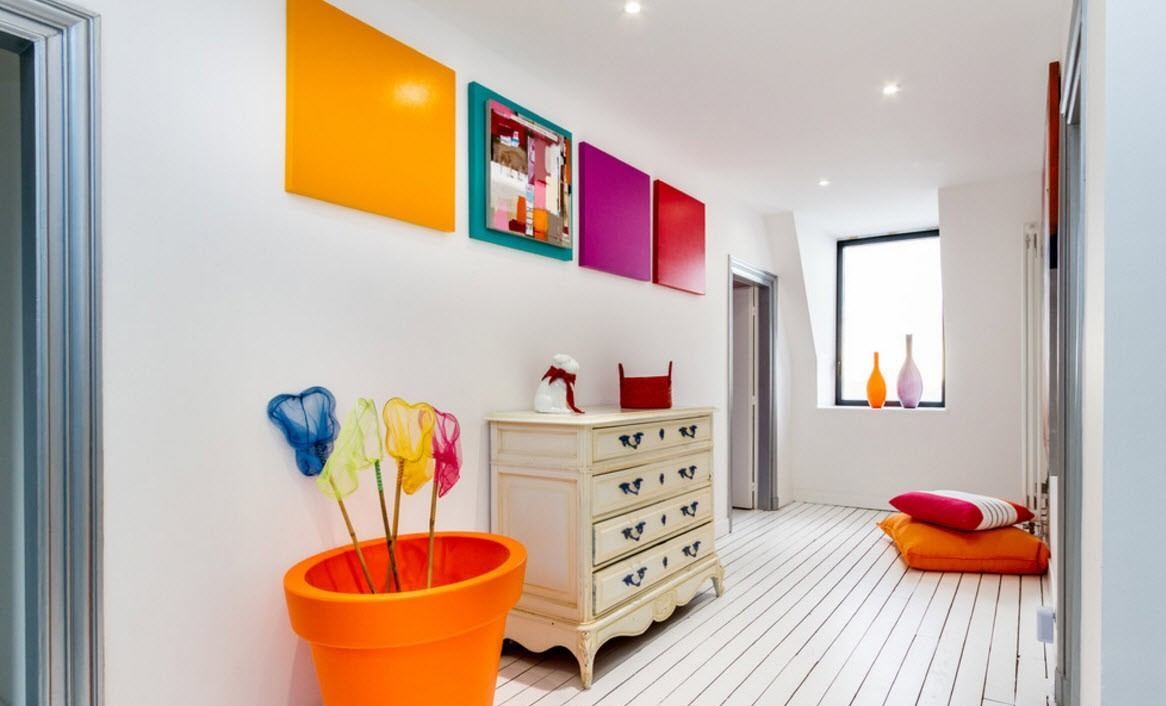 - O esquema de cores e o estilo geral da imagem devem se sobrepor ao restante do interior. Por exemplo, se todo o apartamento for decorado com texturas “ásperas” de tons escuros, a paisagem industrial brilhante se tornará o centro do corredor.
