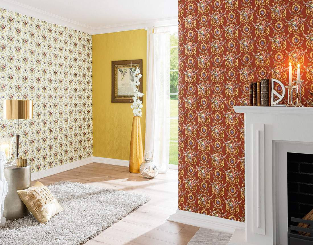 Rolos figurados ou selos prontos criam um único ornamento em toda a superfície das paredes. Para criar um interior claro, o padrão é sombreado com tinta ou glitter. Emplastro veneziano imita texturas de mármore de vários tons, combinado com afrescos e estuque dá uma sombra para o interior do palácio.