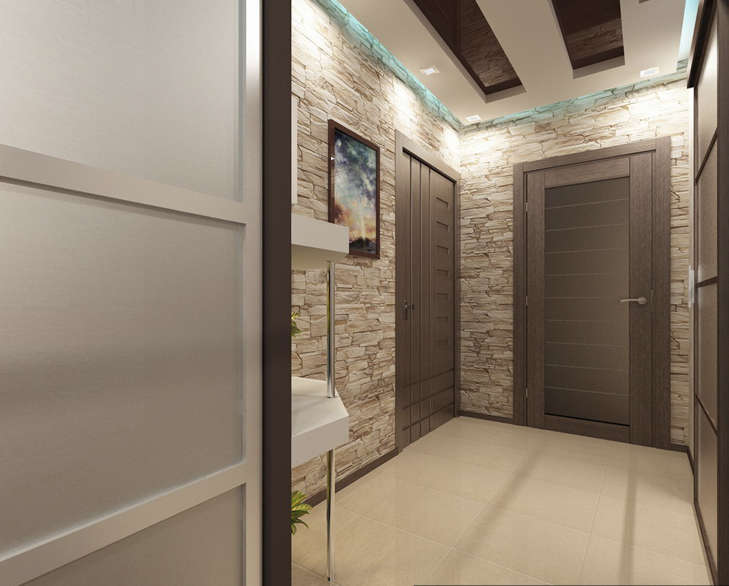 Este acabamento se torna o sotaque do corredor, envolve o uso de um esquema de cores neutras no interior. É melhor colocar a imagem em uma parede livre, para não sobrecarregar a sala.