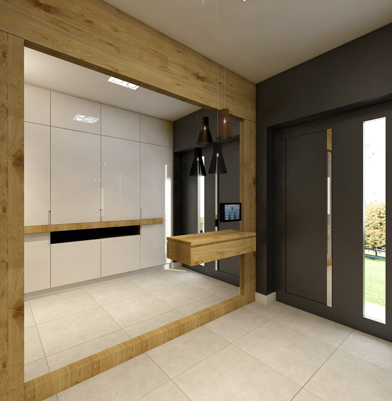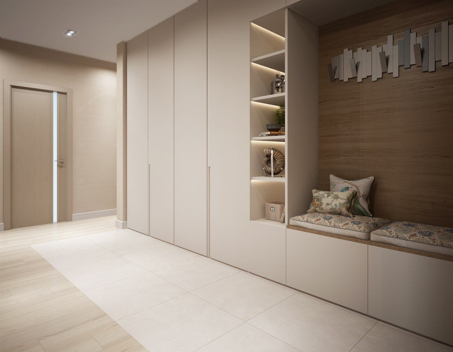 Painéis estreitos revestidos com zonas laminadas brilhantes ou foscas no espaço do corredor. Tons de madeira natural são combinados com cores quentes, iluminação auxiliar e espelhos decorativos.