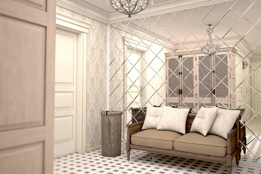 O arranjo de espelhos decorativos no interior expande o espaço, divide os grandes corredores em corredores funcionais. zonas. Painéis grandes parecem uma única tela, as juntas de pequenos elementos são decoradas com decoração.