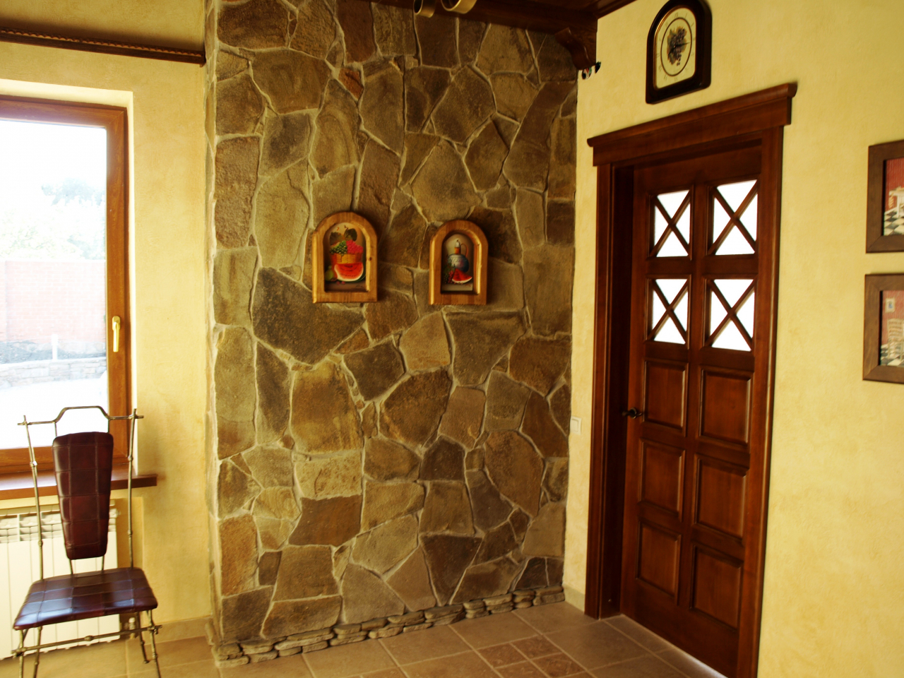 Painéis de fachadas de pedra dão ao interior do salão uma monumentalidade, o material é durável, adequado para a maioria dos estilos de decoração. As desvantagens dos acabamentos em pedra são o alto preço, a complexidade do trabalho realizado e o grande peso do material.