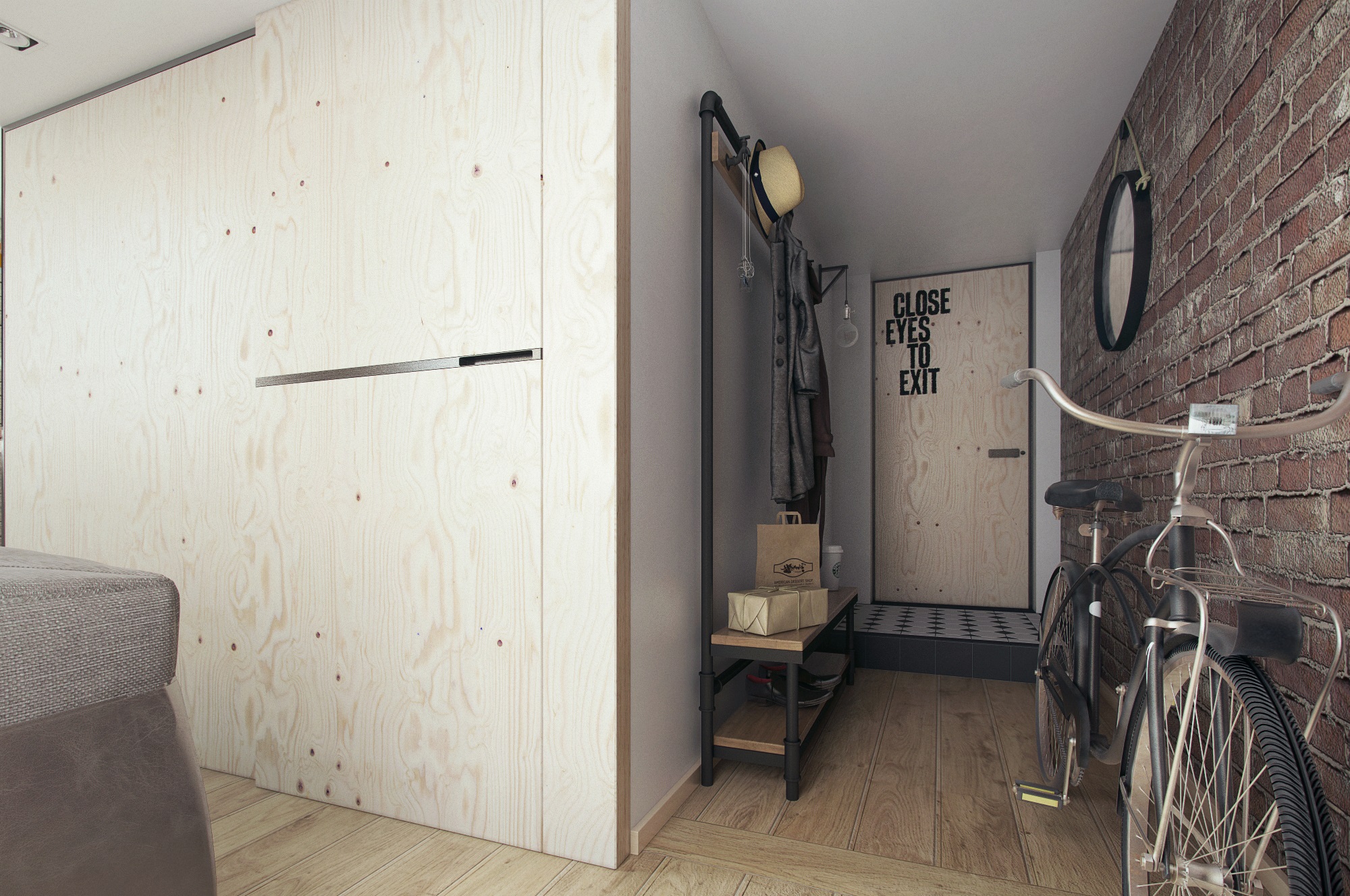 De frente para o corredor com pedra cria um interior lacônico em um estilo industrial. Complemento material: