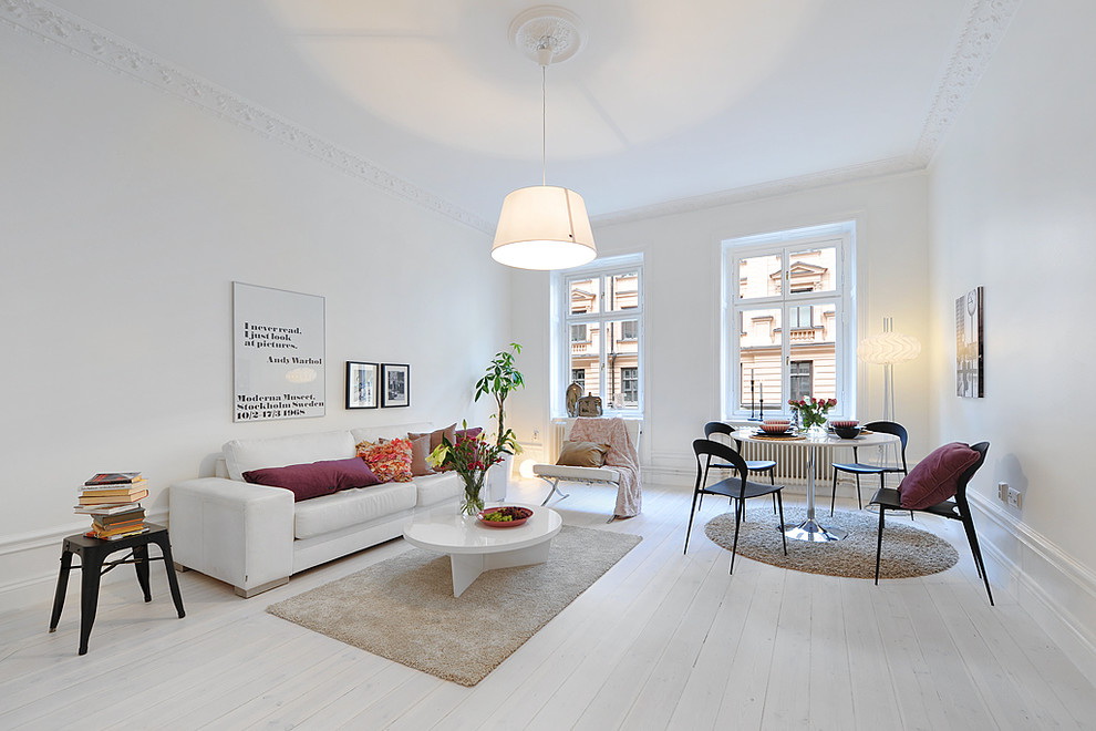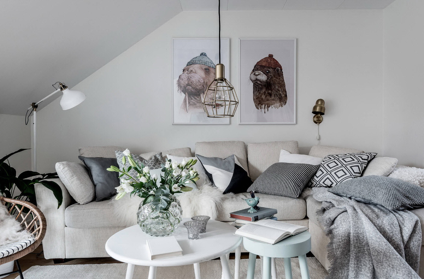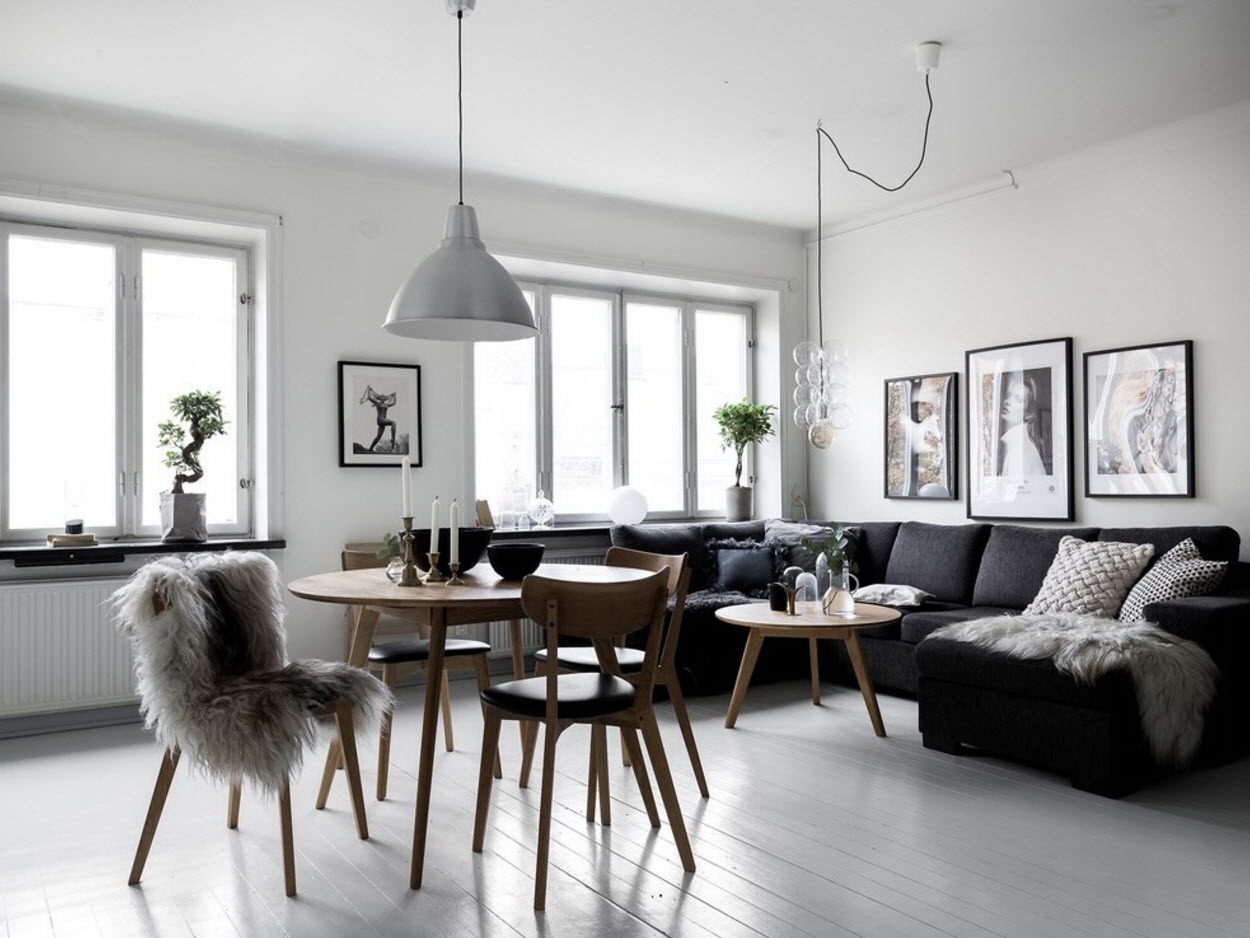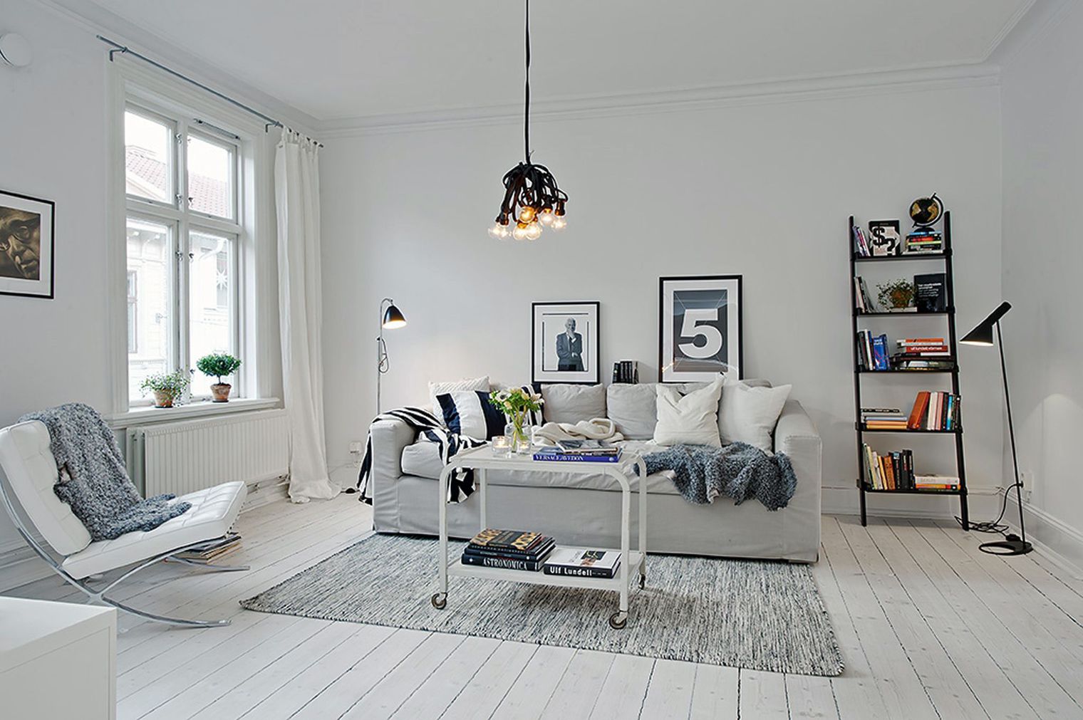 As paredes da sala de estar no estilo escandinavo devem ser perfeitamente lisas, ficam melhores quando pintadas de branco. Os pisos são de madeira e cobertos com tinta branca, o laminado também pode ser usado como revestimento de piso.