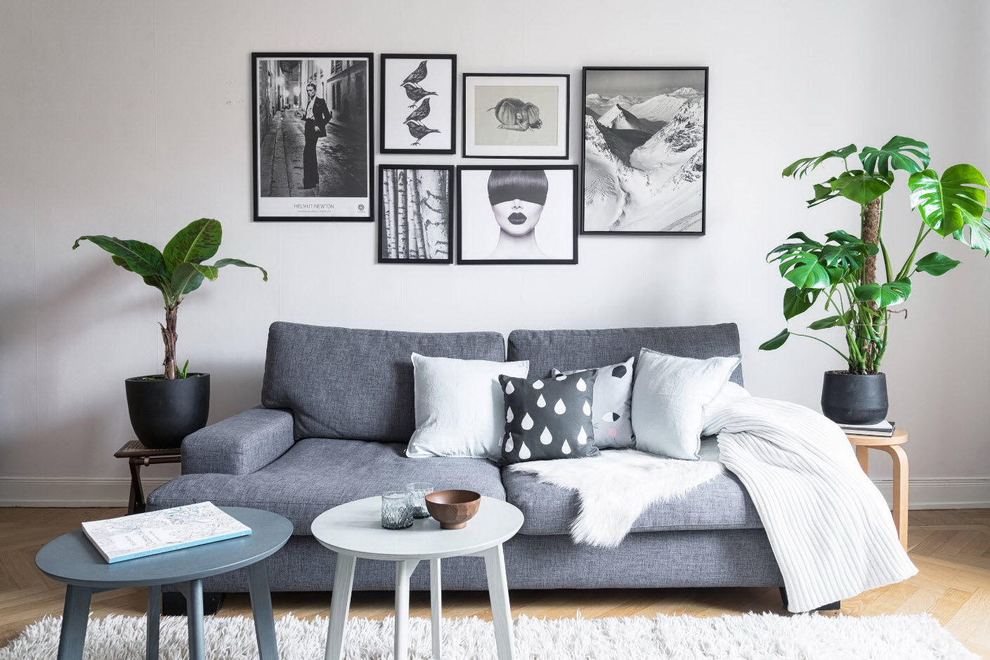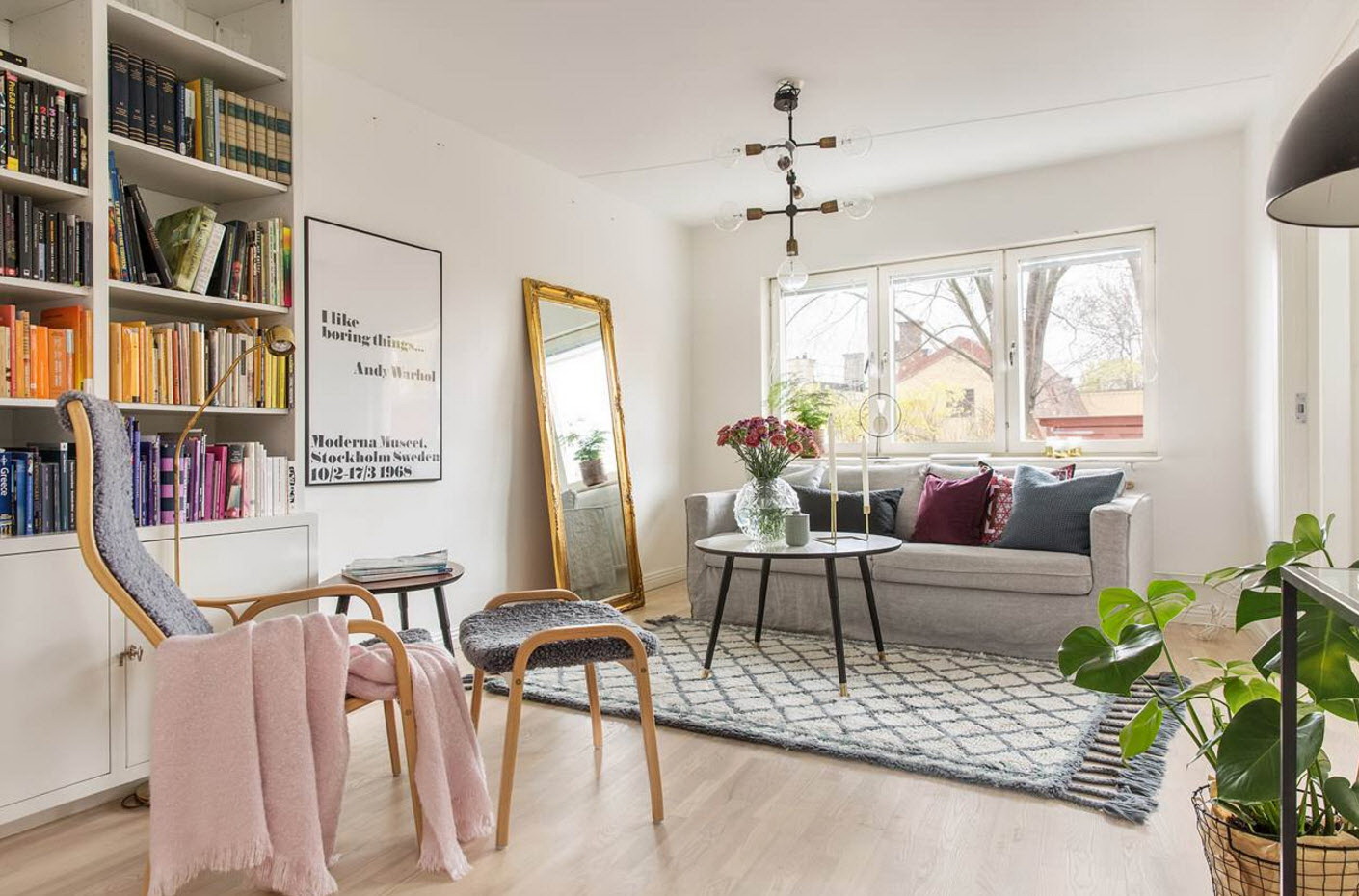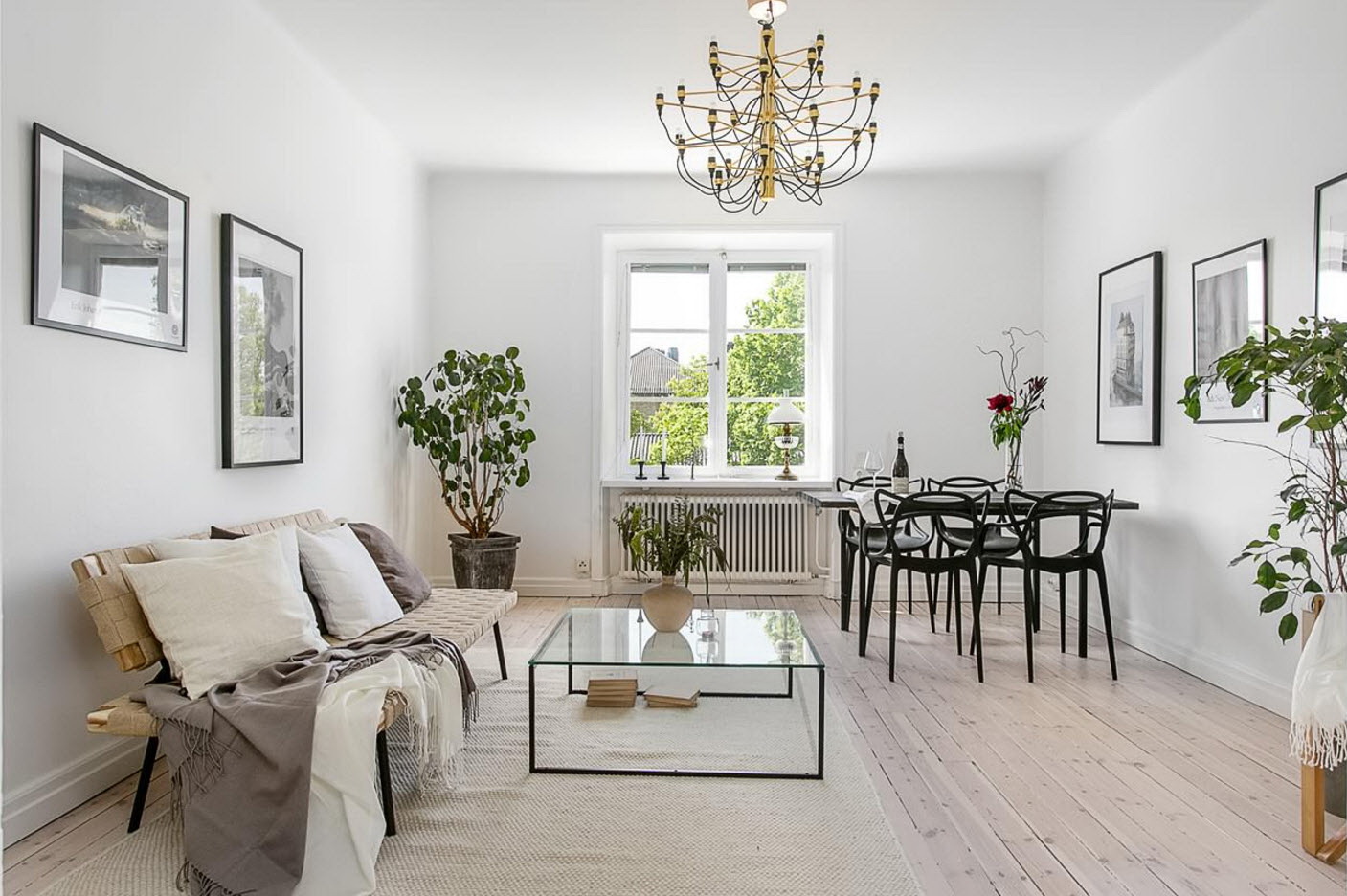 As paredes da sala de estar no estilo escandinavo devem ser perfeitamente lisas, ficam melhores quando pintadas de branco. Os pisos são de madeira e cobertos com tinta branca, o laminado também pode ser usado como revestimento de piso.