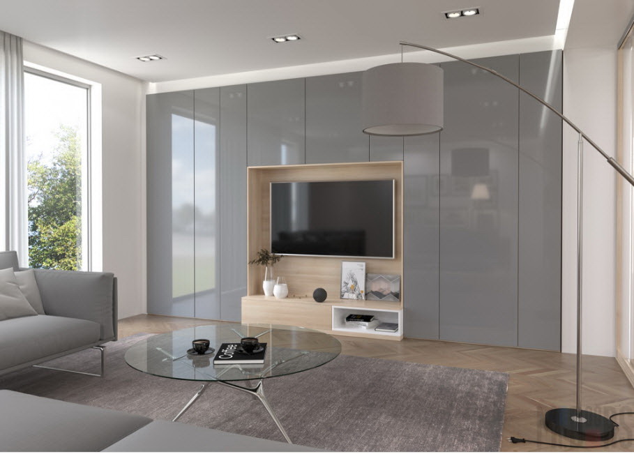Sala de estar neste estilo implica a presença de um home theater. Se essa opção não estiver disponível, você poderá escolher uma grande TV de tela plana. O equipamento do local de trabalho com um computador moderno ou laptop é permitido.