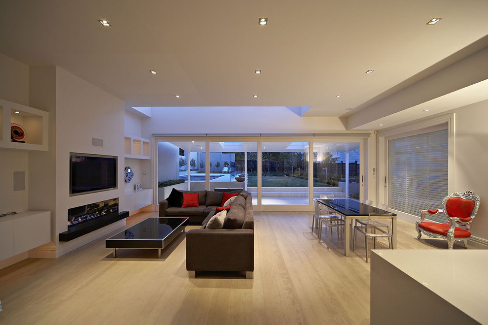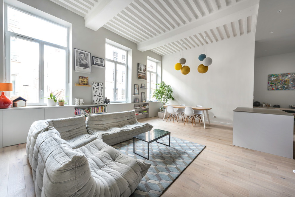 A iluminação na sala de estar, feita em estilo escandinavo, é representada por numerosas fontes: