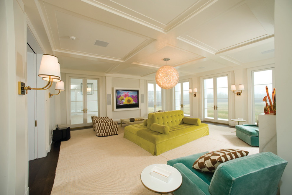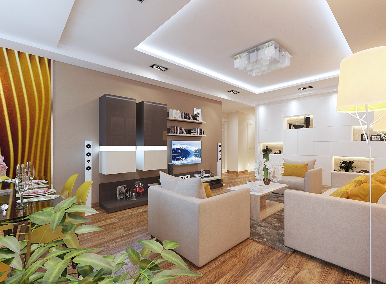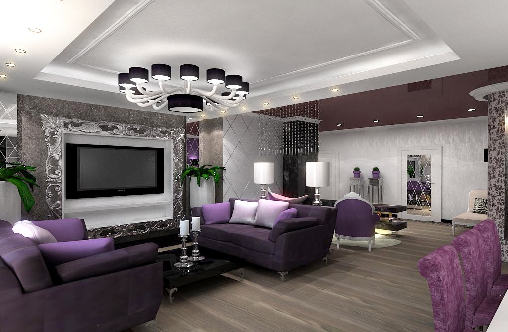 O tecto pode ser liso e em relevo, os tectos multi-níveis são amplamente utilizados na sala de arte.
