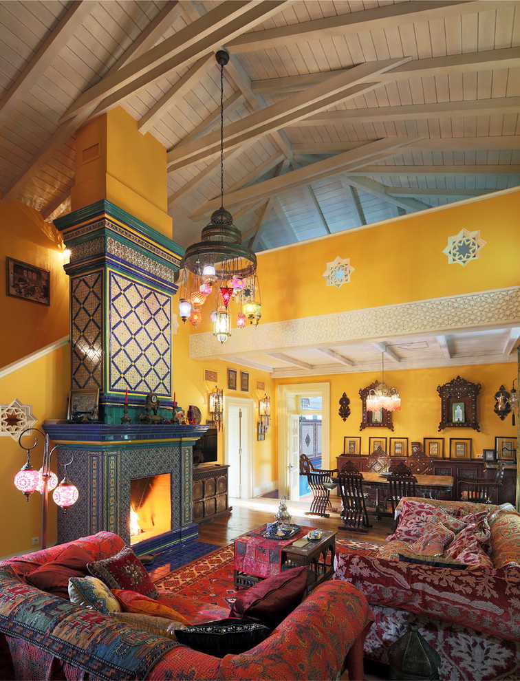 Um atributo integral são cortinas pesadas de veludo ou cetim, travesseiros com bordados com bom aspecto. Um luxuoso tapete leve ajudará a complementar a atmosfera de conforto que consome tudo.
