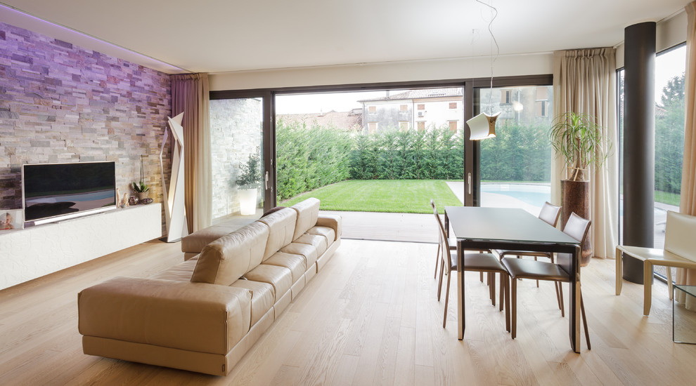 Para a decoração das paredes, como regra, use um esquema de cores neutras. Parquet ou laminado de cores claras é usado para o chão. Um pré-requisito para a sala de estar em estilo moderno é o uso de materiais modernos, tais como: