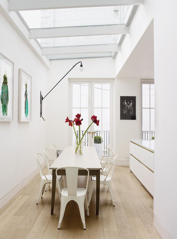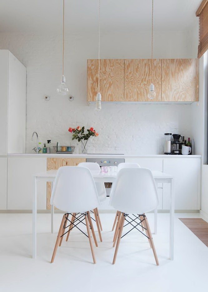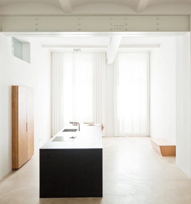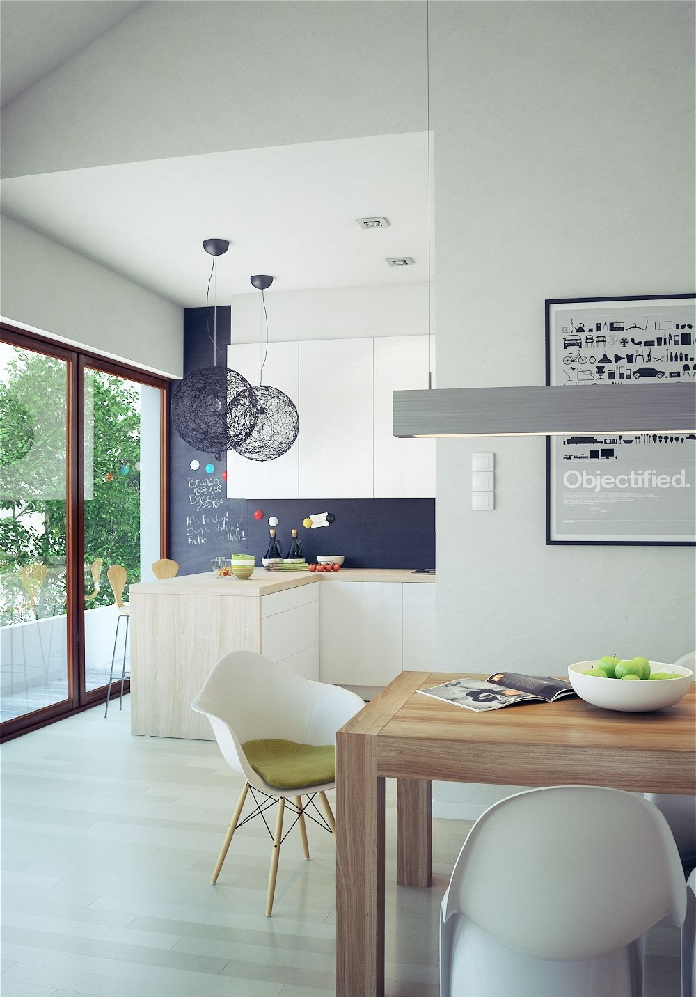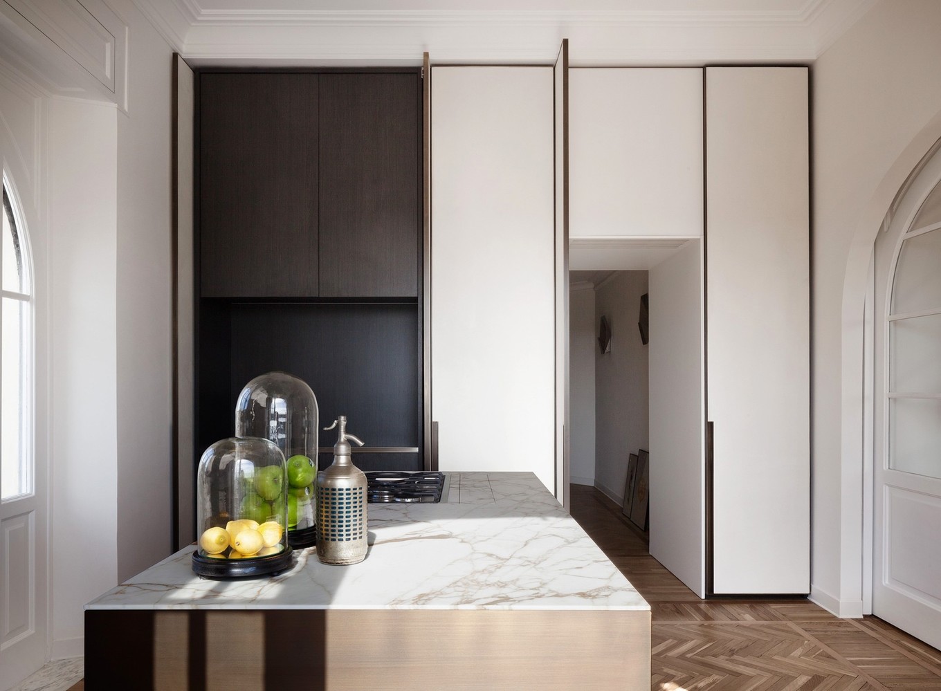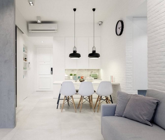 O layout aberto entre a cozinha e o espaço permite que uma abundância de luz preencha o espaço. As superfícies claras das paredes, detalhes modernos e limpos, espaços despojados, uma paleta neutra (com alguns toques de cor) fazem um apelo por interesses calmos.
