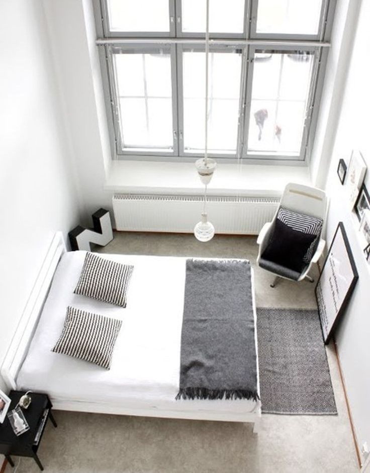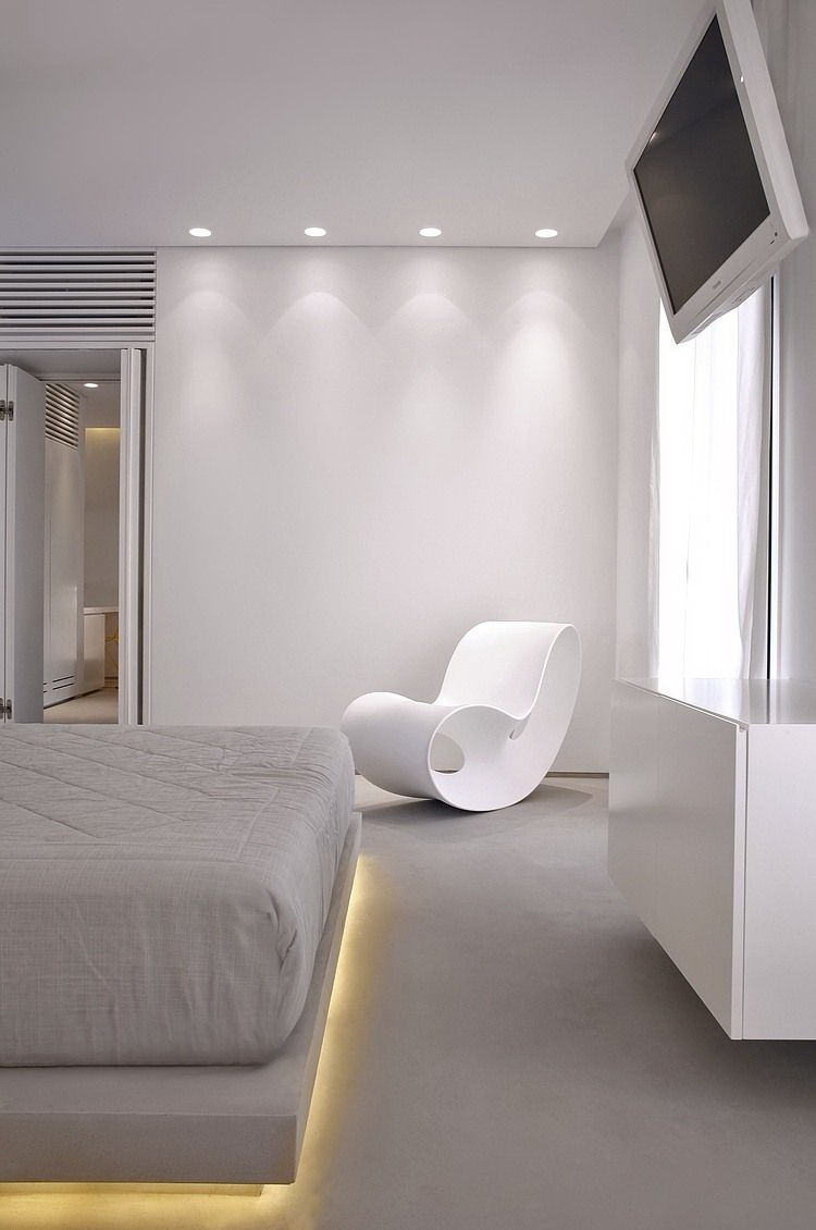 - quarto branco. A base do quarto mínimo é as paredes. A grande maioria deles é pintada de branco, o que se encaixa melhor aqui, como o mais puro. Mas se houver luz suficiente no seu quarto, tons neutros como cinza, bronzeado também funcionam bem;