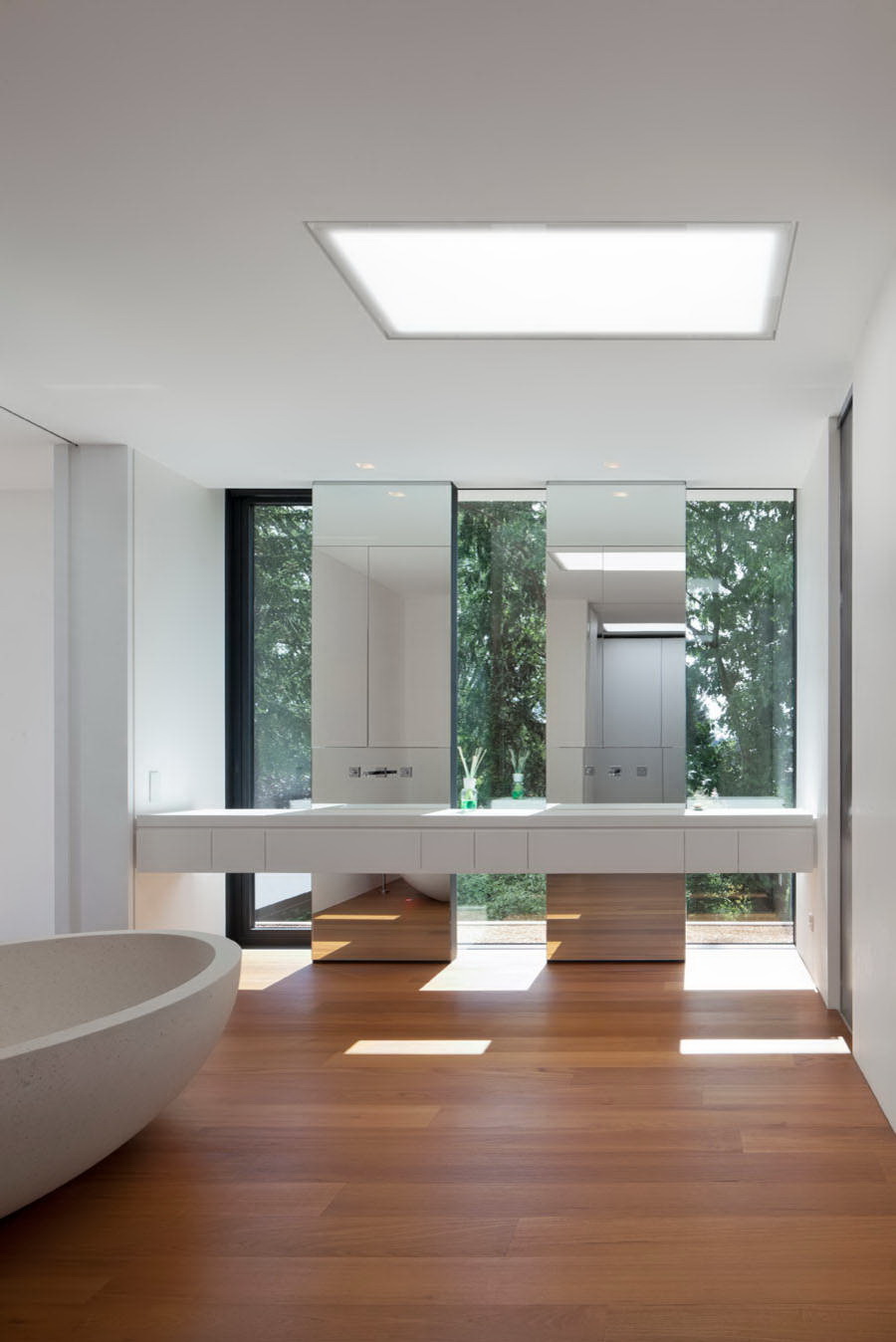 Os espelhos desempenham um grande papel no design interior minimalista para aumentar os espaços menores. Para o revestimento, o minimalismo estimula o uso de azulejos grandes que dão ao ambiente uma aparência perfeita. Eles ficam longe de parquete e outros elementos de design complexos semelhantes. Em interiores minimalistas, superfícies brilhantes e foscas podem se correlacionar com elementos polidos brilhantes.