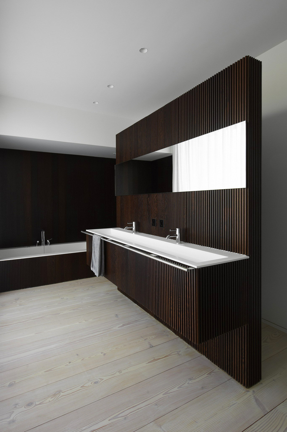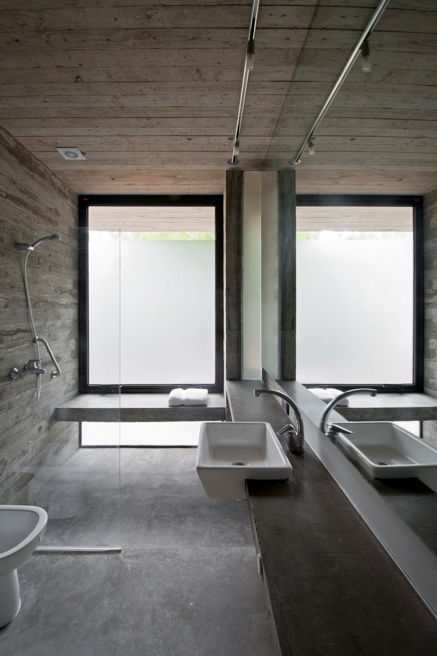 A paleta de materiais para a sala de estar pode ser limitada principalmente ao concreto e ao vidro.Concreto fornece textura, interesse em design de interiores minimalista. Textura, telhas de grãos combinados com uma paleta neutra simples em um banheiro moderno.