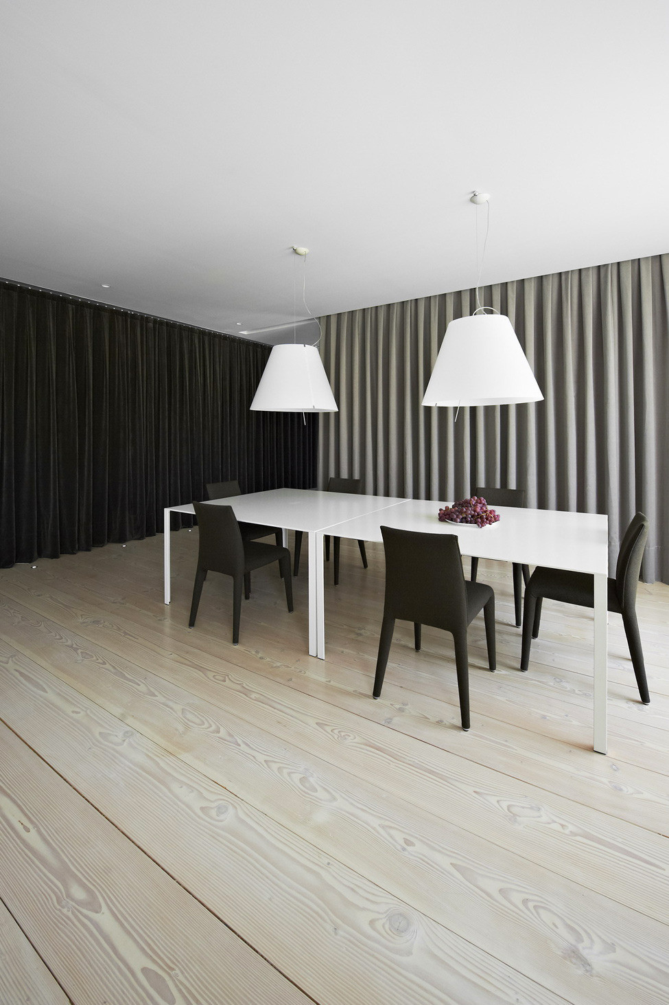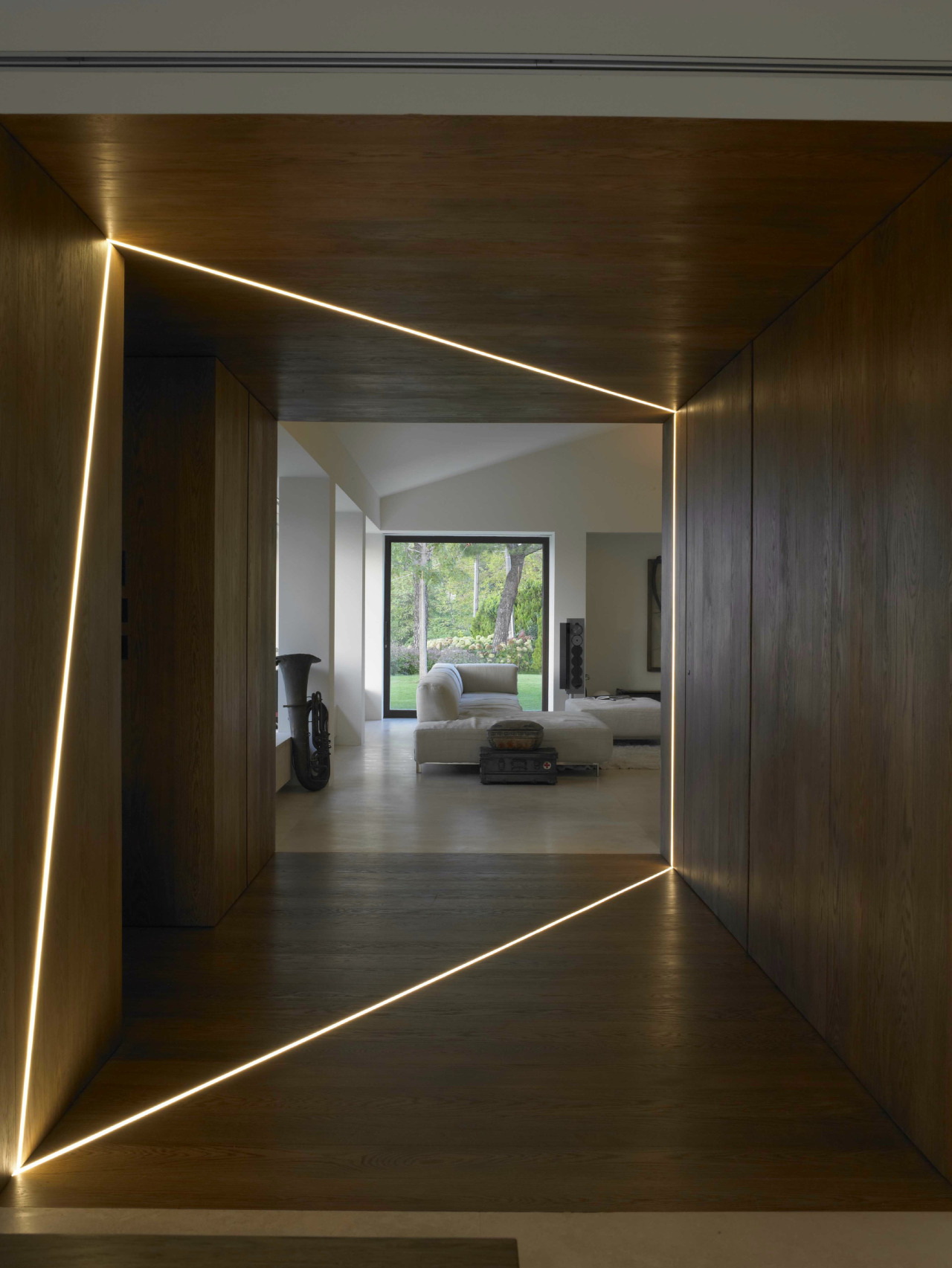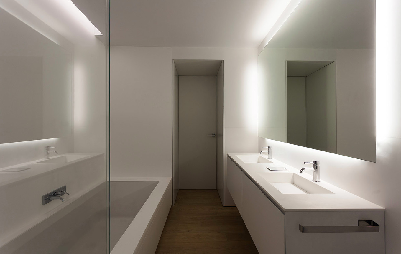 - piso de mármore polido, acentuado com uma incrustação de bronze na paleta monocromática para refletir os caixilhos das janelas;
