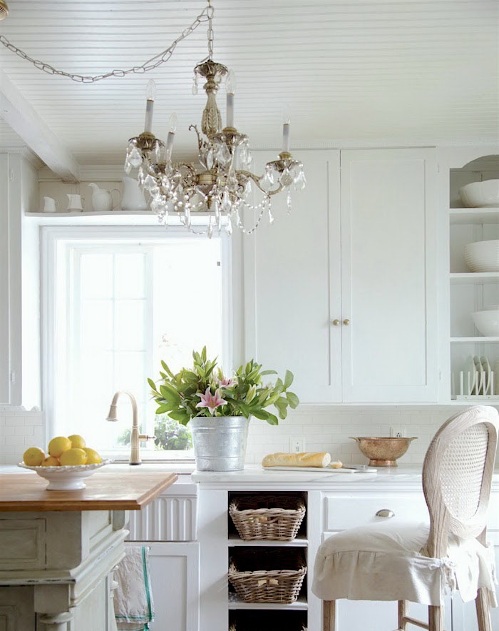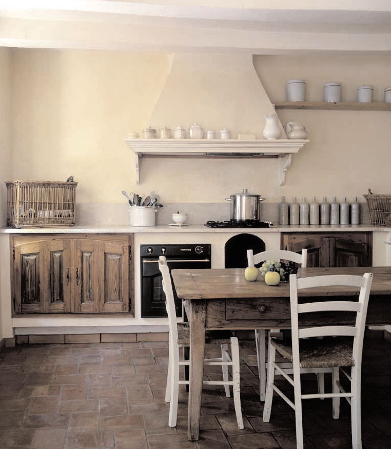 Opção universal - cor branca para pintura e posterior envelhecimento da superfície. Em interiores de cozinha de Provence, a superfície pode ser decorada com pintura floral.
