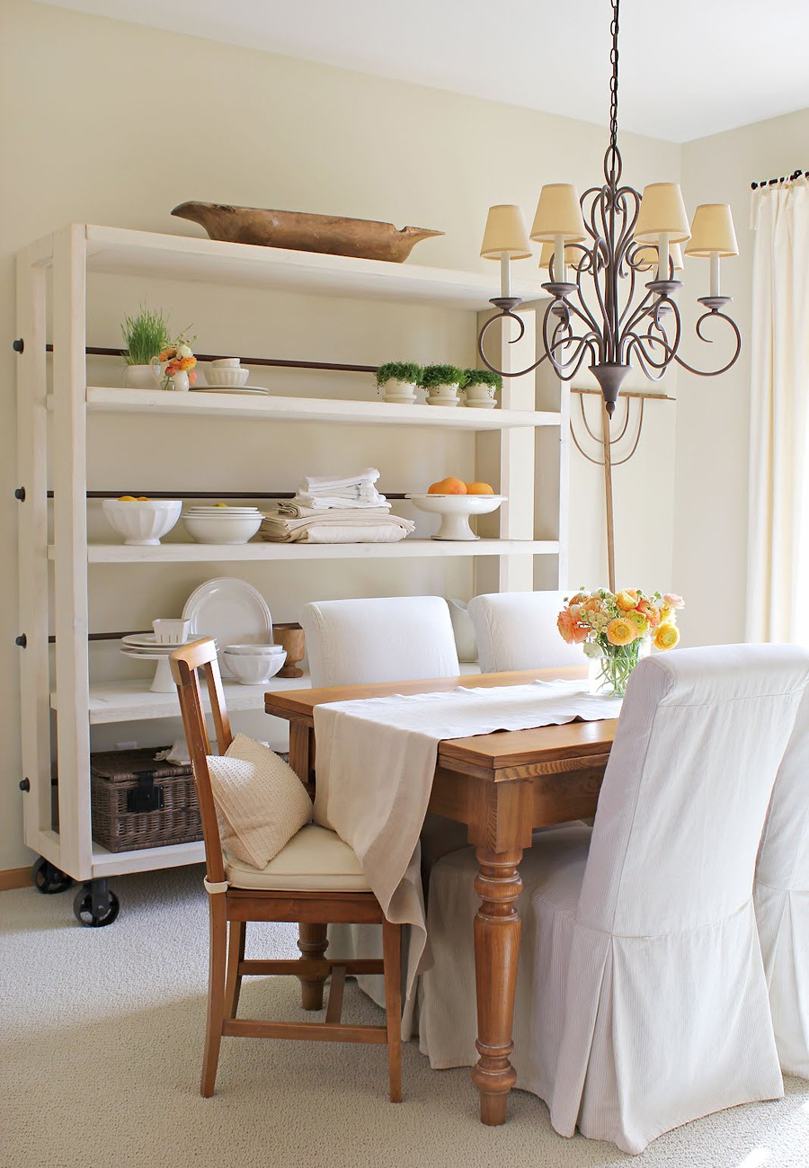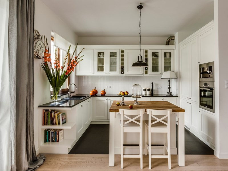 - a presença de prateleiras abertas, armários, prateleiras e janelas;