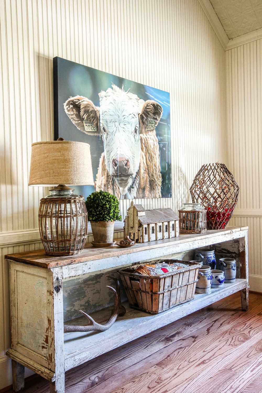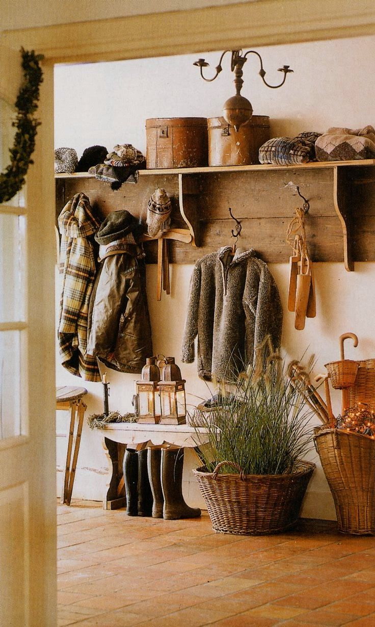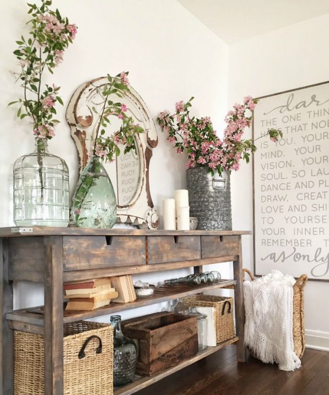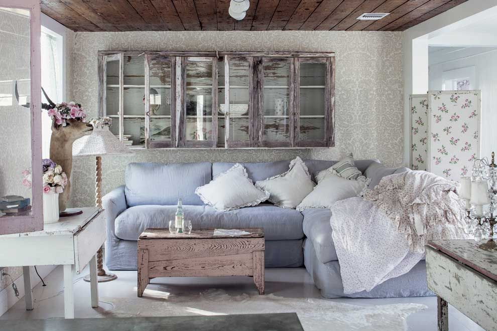 A placa da antiguidade, peculiar ao estilo, possibilita a introdução de elementos vintage no interior. Além disso, móveis e acessórios envelhecidos artificialmente são usados ativamente no design.