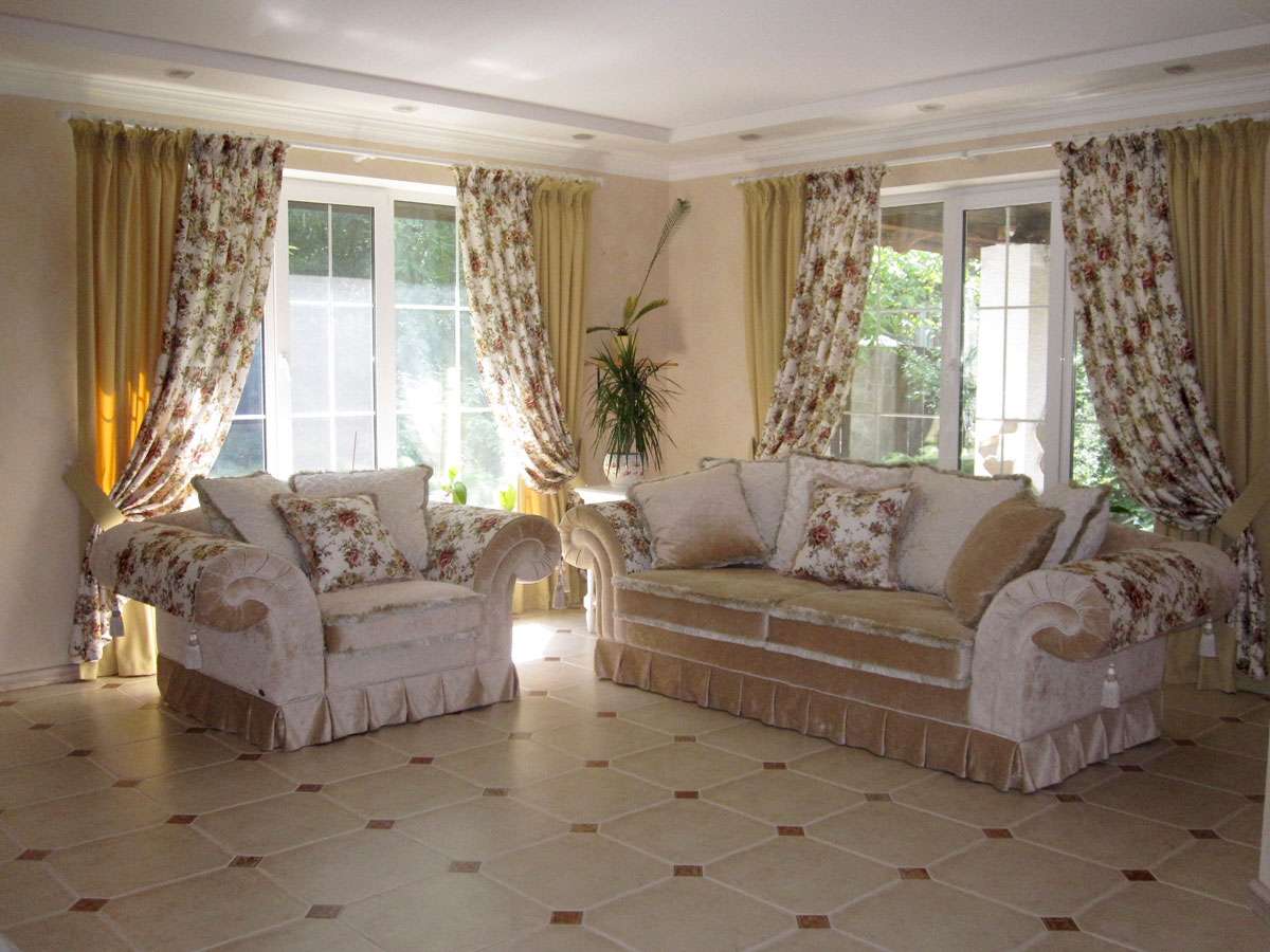 Cortinas são selecionadas de luz, sem cortinas complicadas e pesados lambrequins.Tecidos leves naturais para cortinas podem ser montados em molduras de madeira ou forjadas. Se for escolhido um modelo forjado, é desejável que ele esteja na forma de elementos e em cores com outros objetos na sala, como castiçais, candelabros, arandelas de parede, etc.