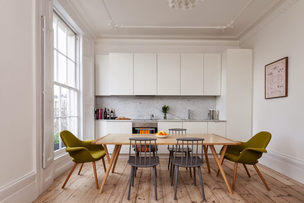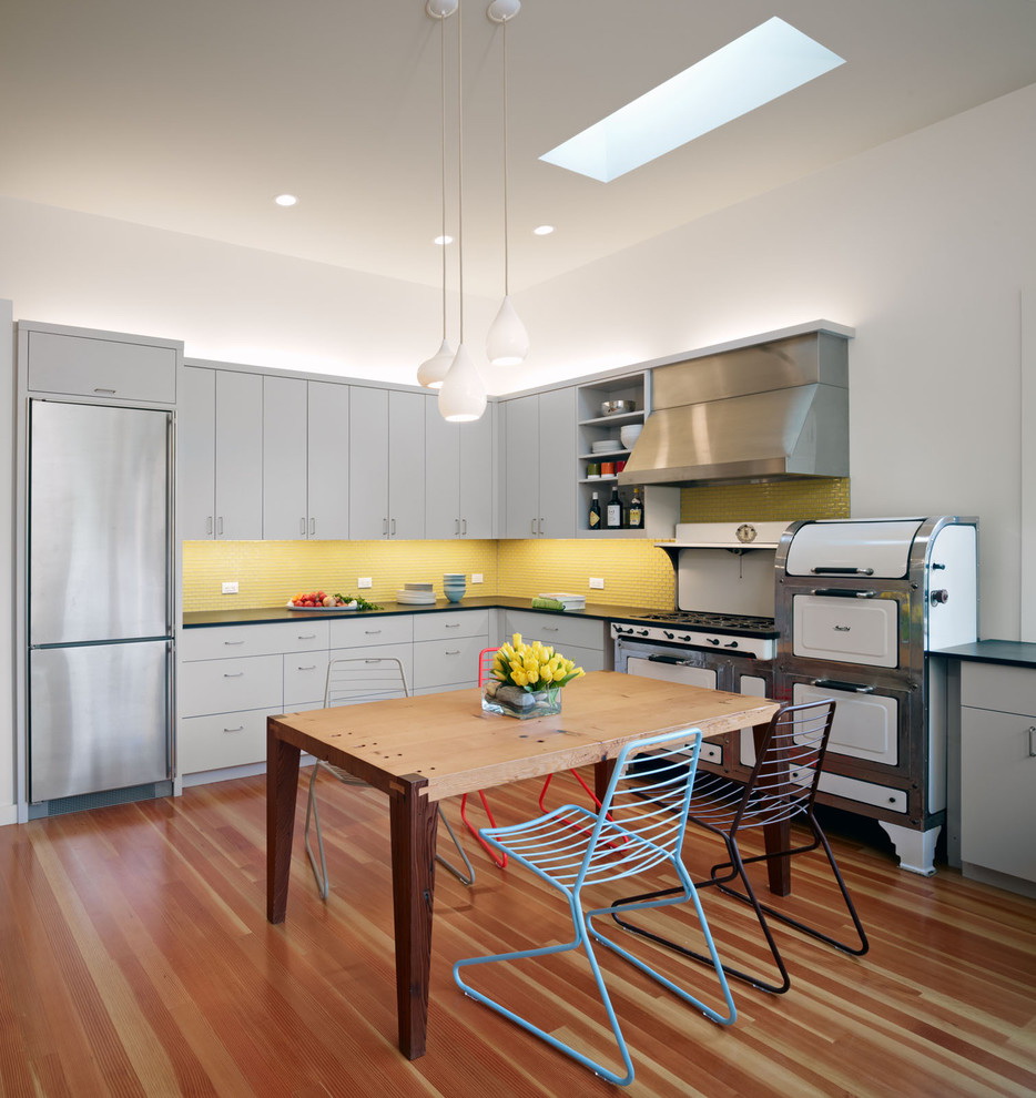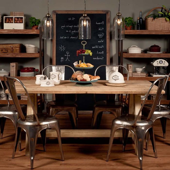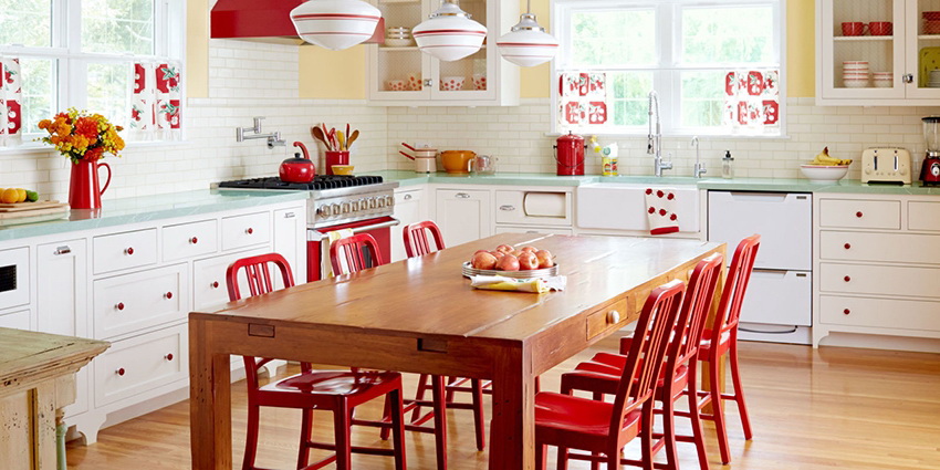 Estilo Diner: uma vez que este período é bem reproduzido no design da cozinha, considere a adição de cadeiras de banquete à cozinha ou um par de bancos de bar da lanchonete dos anos 50 ao seu restaurante. a mesa para o café da manhã.