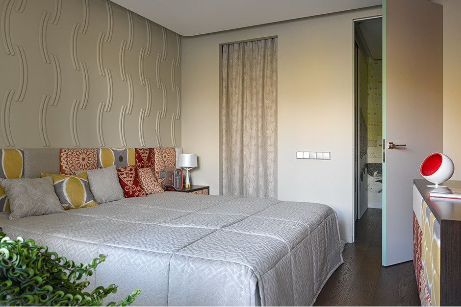 Soluções de design arrojadas e inesperadas: multicoloridas lustrescolorido cortinas, móveis brilhantes, mistura surpreendentemente confortável de superfícies de laca brilhante e estofamento de couro. Uma variedade de cores, fotos individuais em estilo retro.