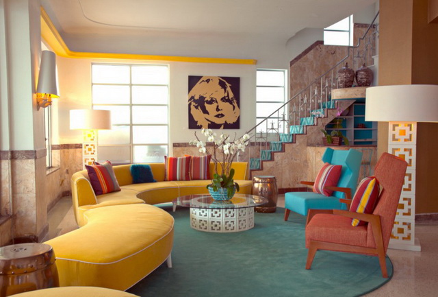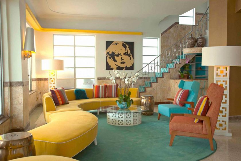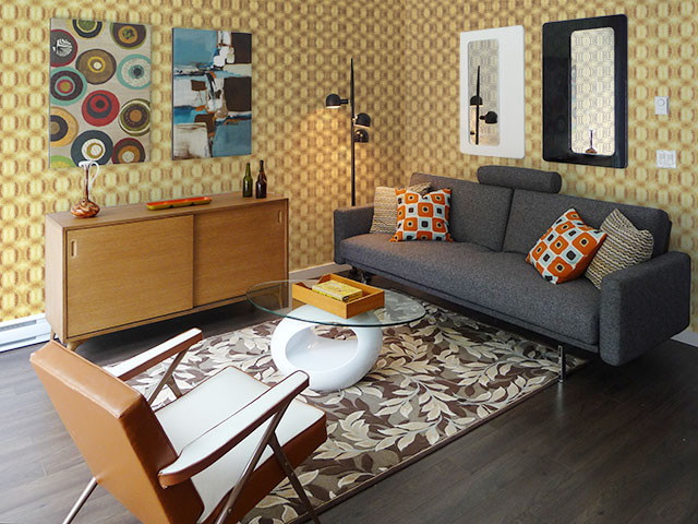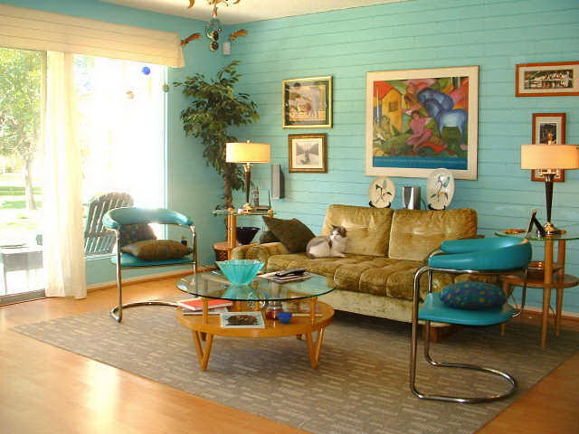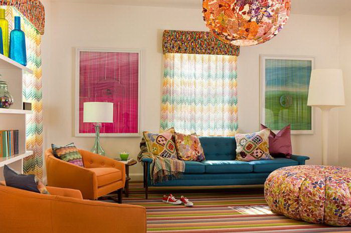 Estilo retro em design de interiores é formas extravagantes, combinações de cores, texturas. É determinado pelo brilho, originalidade: figuras de plástico com discos de vinil, pinturas com fotografias de cidades, lâmpadas de lava com lábios de sofá, uma combinação de vidro, plástico, metal com sintéticos (principalmente couro artificial, veludo), bordados com miçangas cortinas e padrões assimétricos.